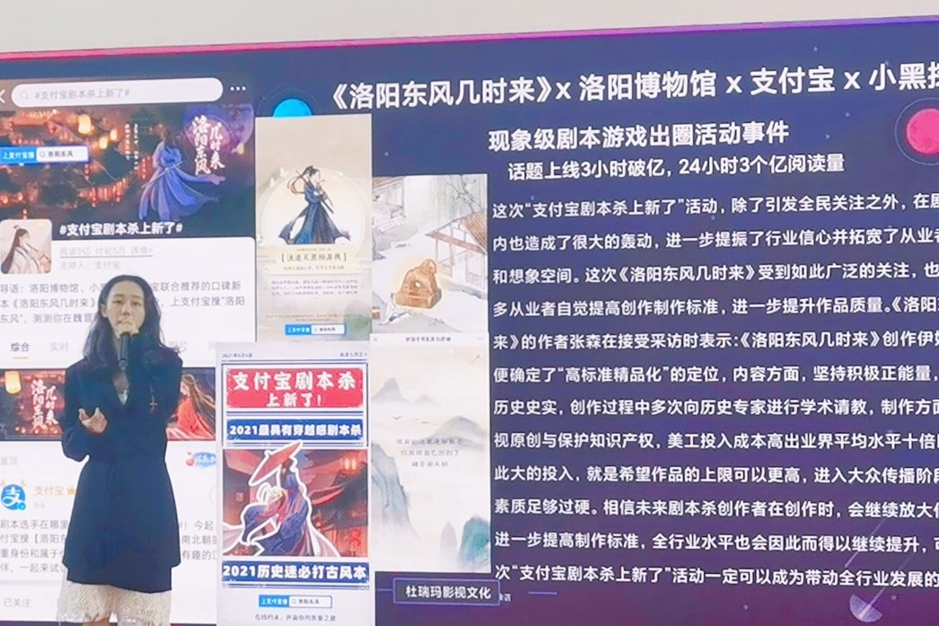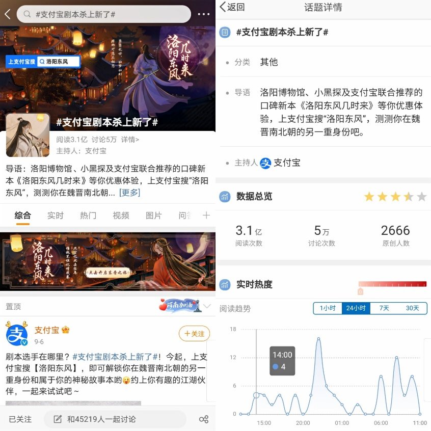 而在更早之前的9月6日,一條「#支付寶劇本殺上新了#」的微博熱搜更是在一天之內就突破了3億閱讀量,使「劇本殺」這個之前尚屬小眾的新興文藝娛樂形式迅速破圈,引來上億國人的關注目光,熱搜中的劇本殺作品便是《洛陽東風幾時來》,同時,《洛陽東風幾時來》的線上聯動小遊戲也迅速引來了上億國人的互動參與。