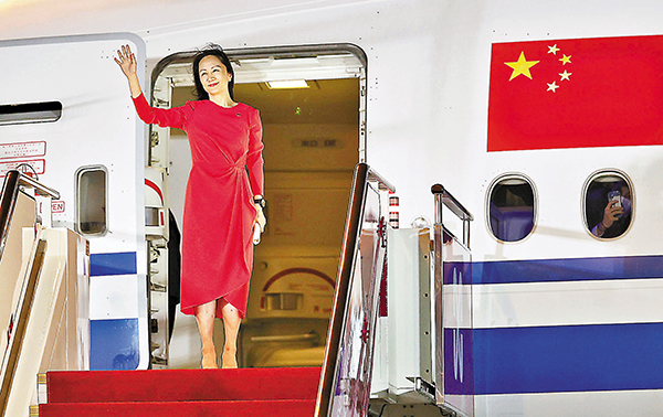 (香港文匯報記者 海巖、毛麗娟 北京、深圳報道)被扣押在加拿大近三年,華為創始人任正非之女孟晚舟當地時間9月24日終於獲釋,摘下電子腳銬。據新華社消息,經中國政府不懈努力,孟晚舟女士乘坐中國政府包機離開加拿大,並已回到祖國,與家人團聚。在加方宣布中止其引渡案後,孟晚舟面對媒體深情表示,「感謝祖國和人民的支持和幫助,這是我走到今天的最大支柱。」中國外交部發言人華春瑩25日晚間再次強調,孟晚舟事件是一宗針對中國公民的政治迫害事件,目的是打壓中國的高技術企業。