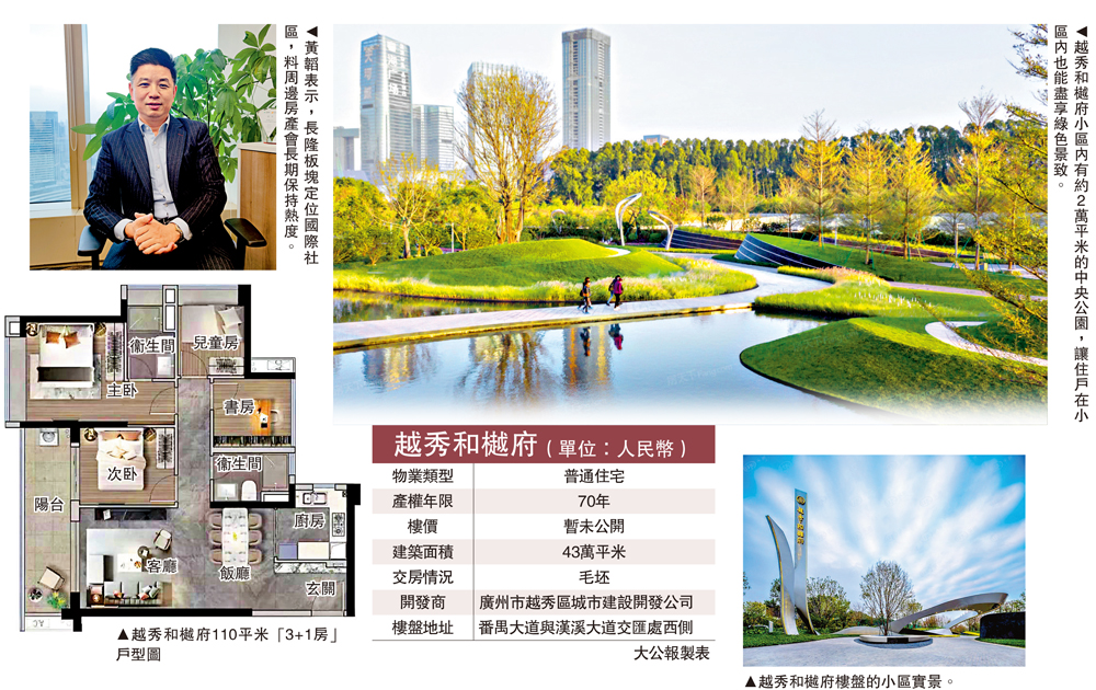 (大公報記者 盧靜怡)港人北上珠三角購置度假物業,實現度假、置業「一箭雙鵰」。本期介紹的是位於廣州長隆野生動物園鄰近的置業新選擇。長隆旅遊度假區位於廣州番禺,擁有長隆集團打造的系列主題樂園,人氣火爆。廣東中原地產項目部總經理黃韜認為,番禺長隆板塊以旅遊及打造國際社區為主要定位,而長隆等旅遊景點不但服務粵港澳大灣區附近消費力強的人群,對全國各地也具有一定的輻射能力,加上鄰近廣州南站這個華南地區最大高鐵樞紐,預計房地產項目會長期保持熱度。