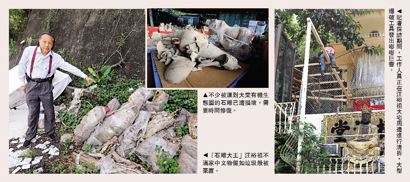 大公報記者 方學明(文) 凱 楊(圖):有「石雕大王」之稱的古董收藏家汪裕祖擁有數千件菩薩、石碑等古董雕像,歷史悠久,數十年來擺放在大埔樟樹灘三層高大宅前一幅約70000平方呎政府租用的土地,恍如古文物園。大公報記者日前走訪上址,眼前只見一片頹垣敗瓦。原來該地因政府中止租約收回,文物無處安身,被政府人員入園拆遷破壞。汪裕祖曾要求政府妥善處理文物,甚至願意捐出展覽,卻不獲受理。