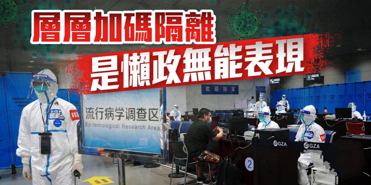內地部分地方當局加碼隔離之風近期有愈演愈烈之勢,如同今年春運期間對返鄉人員健康監測和核酸檢測等方面「加碼歪風」的重演。當時國家衞健委負責人及央媒紛紛批評該亂象,指「層層加碼」和「一刀切」,既有違科學,又是一種懶政,也是對寶貴防疫資源的浪費,各地應及時糾偏,立即整改。
