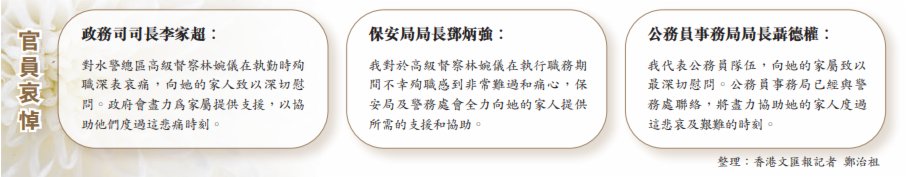 (香港文匯報記者 蕭景源 相關新聞刊A12)上周六(25日)沙洲發生水警小艇遭走私快艇撞翻事故中,墮海失蹤的女高級督察林婉儀連日下落不明、生死未卜,家人及同袍憂心不已。事件昨日踏入第三天,林婉儀的遺體終在大嶼山二澳海面被尋回,證實她已經英勇殉職。當林婉儀的遺體由水警船運往大欖水警基地時,大批同袍及家人在場列隊致哀,有親友目送遺體被運送離開時傷心相擁痛哭,有同袍流下男兒淚。對於有警員英勇殉職,特區行政長官、主要官員及社會各界紛紛發聲明致以深切哀悼。警務處處長蕭澤頤對同袍林婉儀因公殉職深感痛心,向殉職警員家人致以深切慰問,並強烈譴責冷血走私罪犯。他強調,縱使海上執法非常艱辛及危險,水警人員必定會無畏無懼地盡力維護法紀。