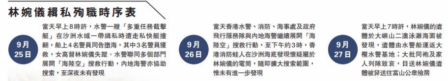 事發上周六早上8時許,水警小艇分區在龍鼓洲近沙洲一帶進行反走私行動期間,其中一艘水警小艇被逃走的走私快艇撞翻,艇上4名警員墮海被困小艇底,其中兩名警員經掙扎自行游上水面,另一名警員由趕至支援的同袍救出,但女高級督察林婉儀則墮海失蹤。連日來,水警、消防、政府飛行服務隊及海事處展開「海陸空」搜救,因事發地點與內地水域分界相近,內地海警亦協助搜救。不幸的是,至昨晨,林婉儀遺體終在大嶼山二澳水域被尋回。