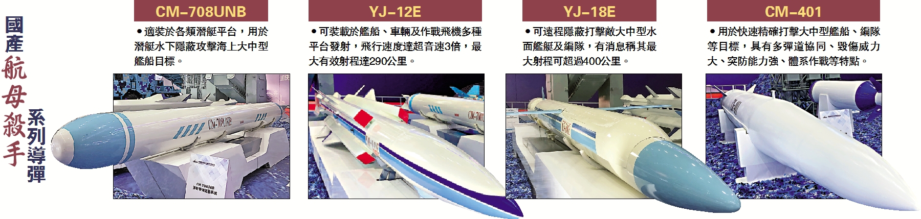 (大公報記者 方俊明、盧靜怡、黃寶儀、帥誠、馬靜)第十三屆中國航展將於28日在珠海揭幕。大公報記者率先探營發現,新版國產反航母作戰「海防體系」亮相,專攻航母的國產反艦巡航導彈YJ-12E(鷹擊)、CM-708UNB(海鷹)潛射導彈協同作戰「組合」尤為矚目。其中,YJ-12E實現裝載於艦船、車輛以及作戰飛機多種平台發射,飛行速度達超音速3倍,能在擊中目標之前執行「空中蛇形機動」,最大有效射程達290公里,被相關軍情專家稱為具有「百萬軍中取敵將首級」的能力;而CM-708UNB可用於潛艇水下隱蔽攻擊海上大中型艦船目標。這顯示中國反航母武器體系正不斷完善。