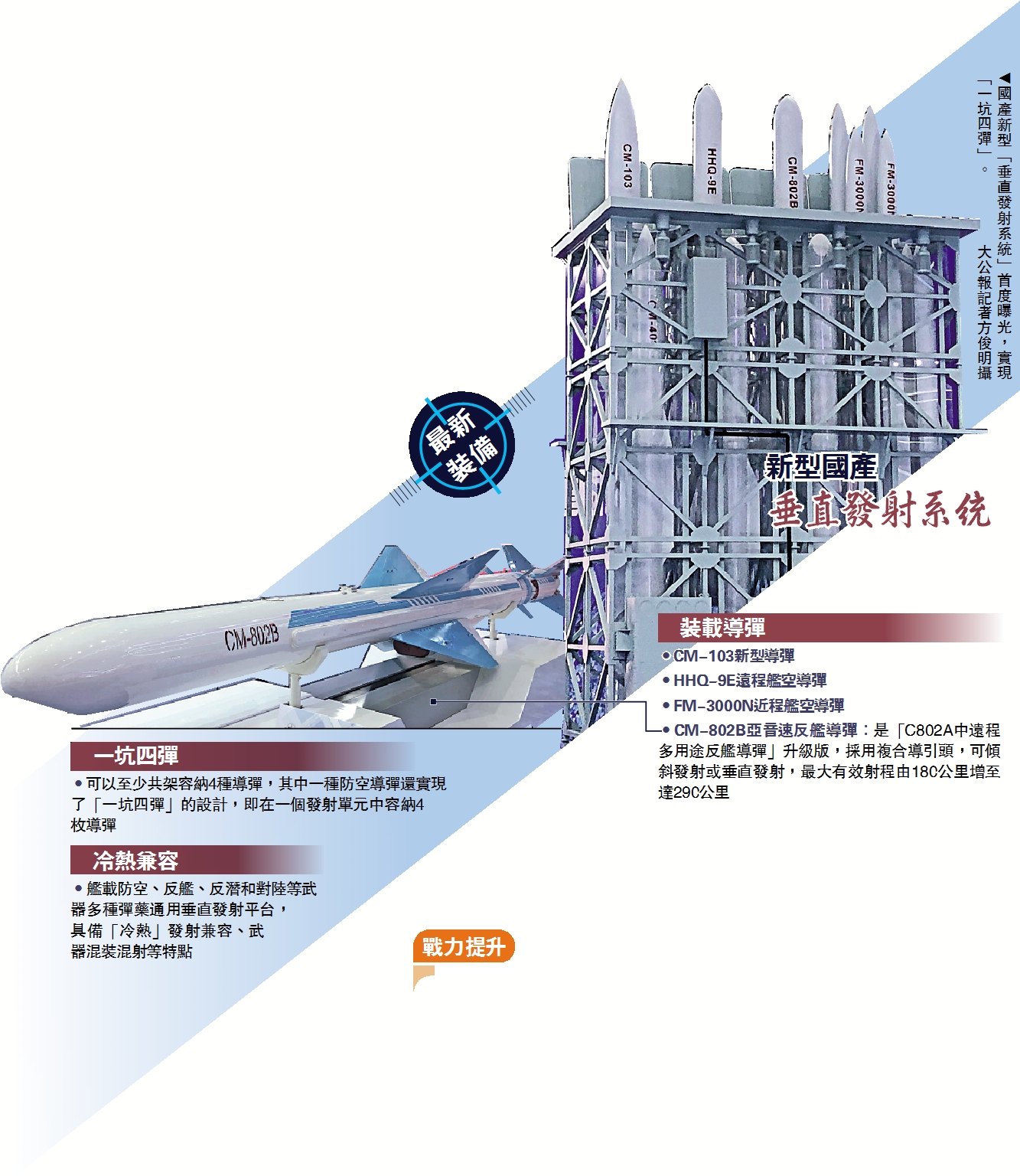 記者也發現,該垂直發射系統展出模型上明確標識裝載的導彈涵蓋了CM-103新型導彈、HHQ-9E遠程艦空導彈、CM-802B亞音速反艦導彈、FM-3000N近程艦空導彈。相關軍情專家認為,今次亮相的新型「垂直發射系統」是在驅逐艦上使用的大型垂直發射系統「升級版」。能容納這樣不同的導彈,證明國產垂直發射系統在冷熱共架發射等技術方面實現新突破。