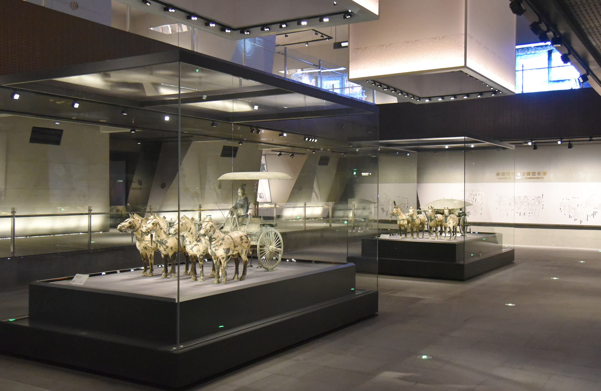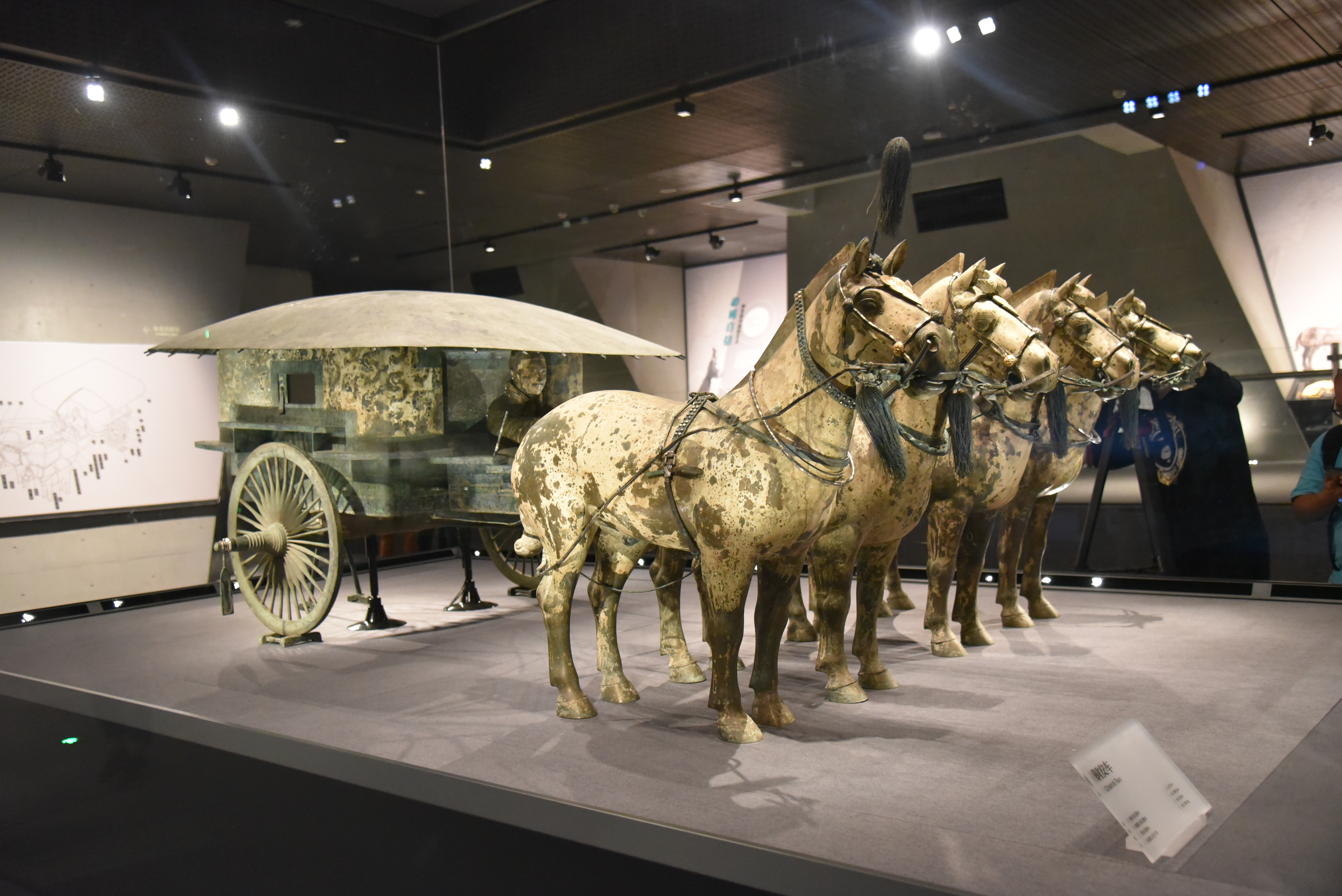 作為博物館的核心展品,位於第一展廳的兩輛銅車馬出土於1980年。其中1號車為立車,敞篷,站立乘車。2號車為安車,車輿密閉,前邊御手駕車,後室則是主人乘坐的地方。銅車馬車馬部件大多用青銅模擬實物鑄造,工藝複雜,製作技術精湛,並施繪不同顏色和紋飾。兩乘車零部件總數超過6000件,秦代工匠們在造車時,至少採用了子母扣加銷釘連接等十餘種連接方法,以及嵌鑄法、包鑄法、鑄焊法等十餘種工藝和技法,被譽為「青銅之冠」。