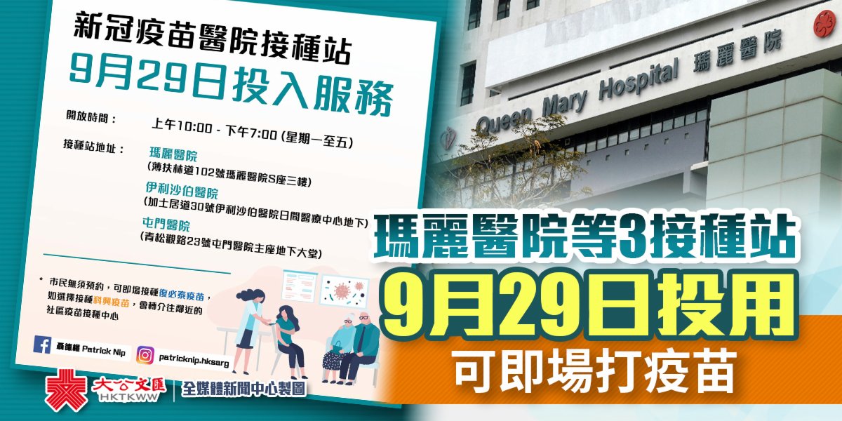 大公文匯全媒體報道,政府在瑪麗醫院、伊利沙伯醫院和屯門醫院設立的新冠疫苗接種站將於明日(29日)投入服務,以方便在醫院覆診的病人和訪客,特別是專科門診的病人,在覆診時即時接種復必泰疫苗,無須預約。公務員事務局局長聶德權將於明日上午10時25分視察瑪麗醫院新冠疫苗接種站。