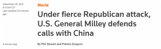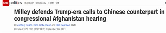 被曝「曾兩度秘密緻電中國軍方高層,向中方保證美國不會發動攻擊」,有關報道震動美國政壇,引發一些共和黨人指責「叛國」、要其辭職後,當地時間9月28日,美國參謀長聯席會議主席馬克·米利出席了一場有關美國從阿富汗撤軍的聽證會,但當米利現身時,外界對於他的焦點卻不在阿富汗問題,而是在他給中國打的兩通電話上。米利證實了這兩次通話,但同時表示,通話對美國政府官員來說並不是什麼秘密,他(當時)正在按照特朗普一些高級助手的指示採取行動,以緩和緊張局勢。