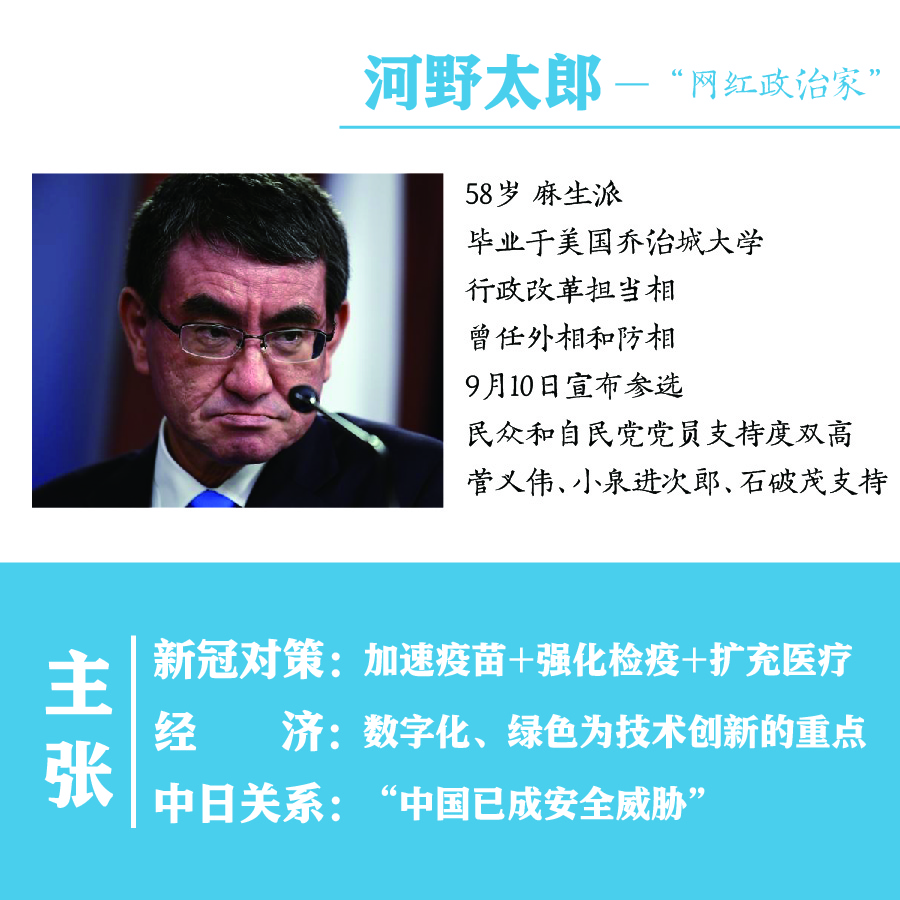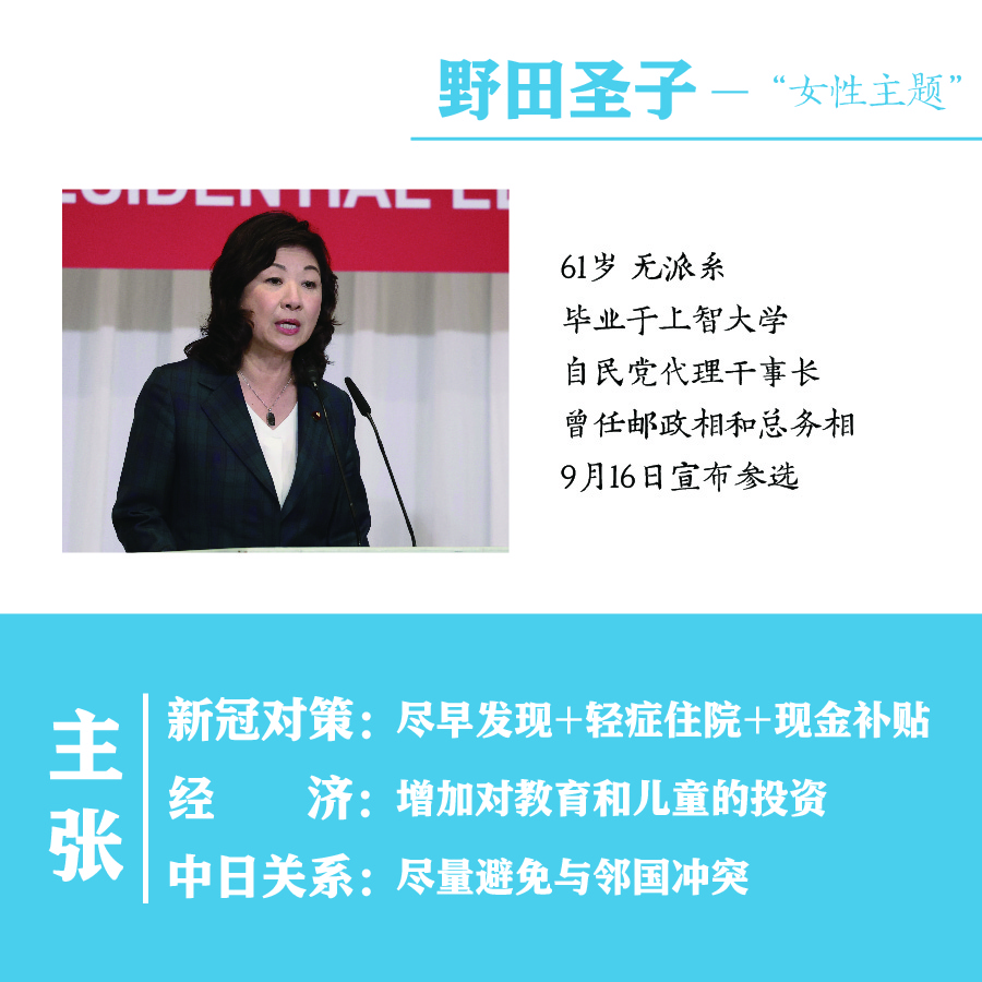 據中新網報道,此次選舉共有四名候選人,分別是現任行政改革相河野太郎、前自民黨政調會長岸田文雄、前總務相高市早苗和現任自民黨代理幹事長野田聖子。
