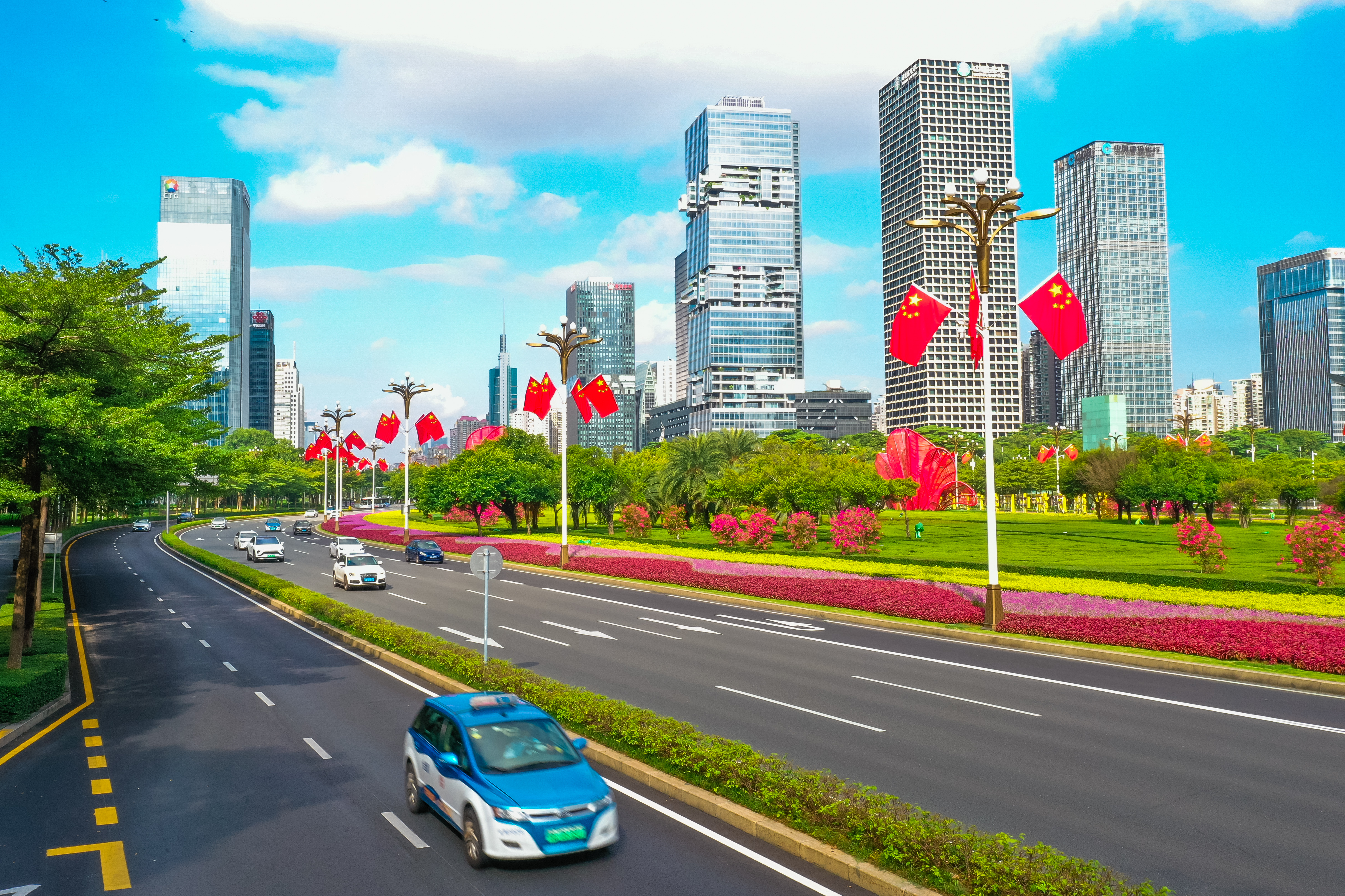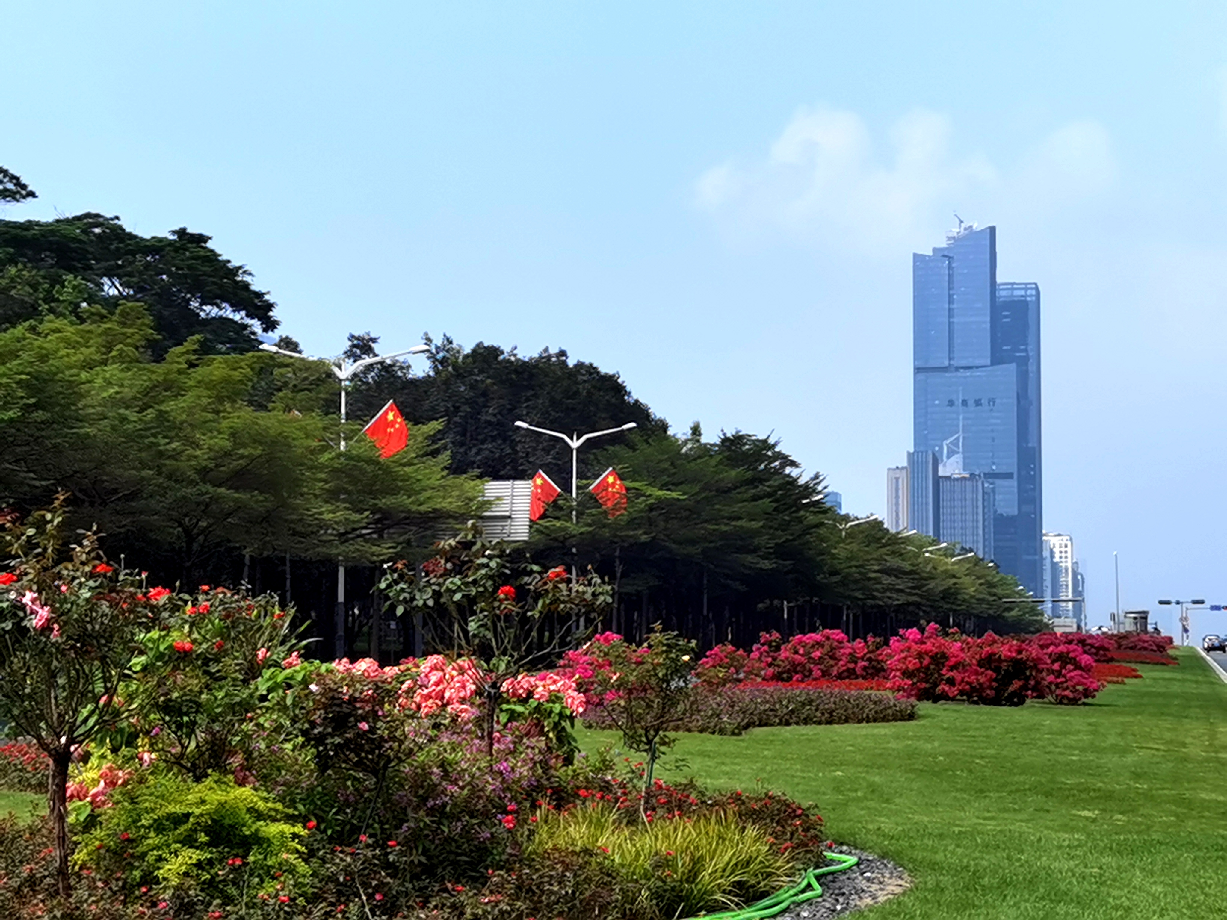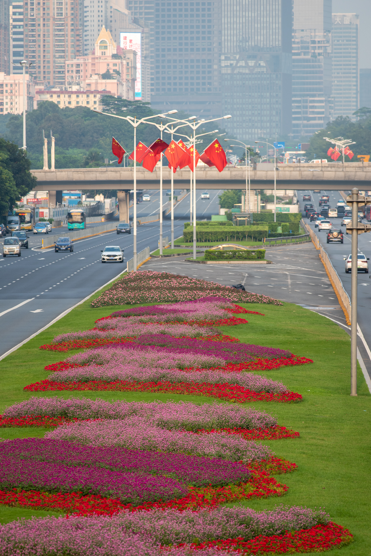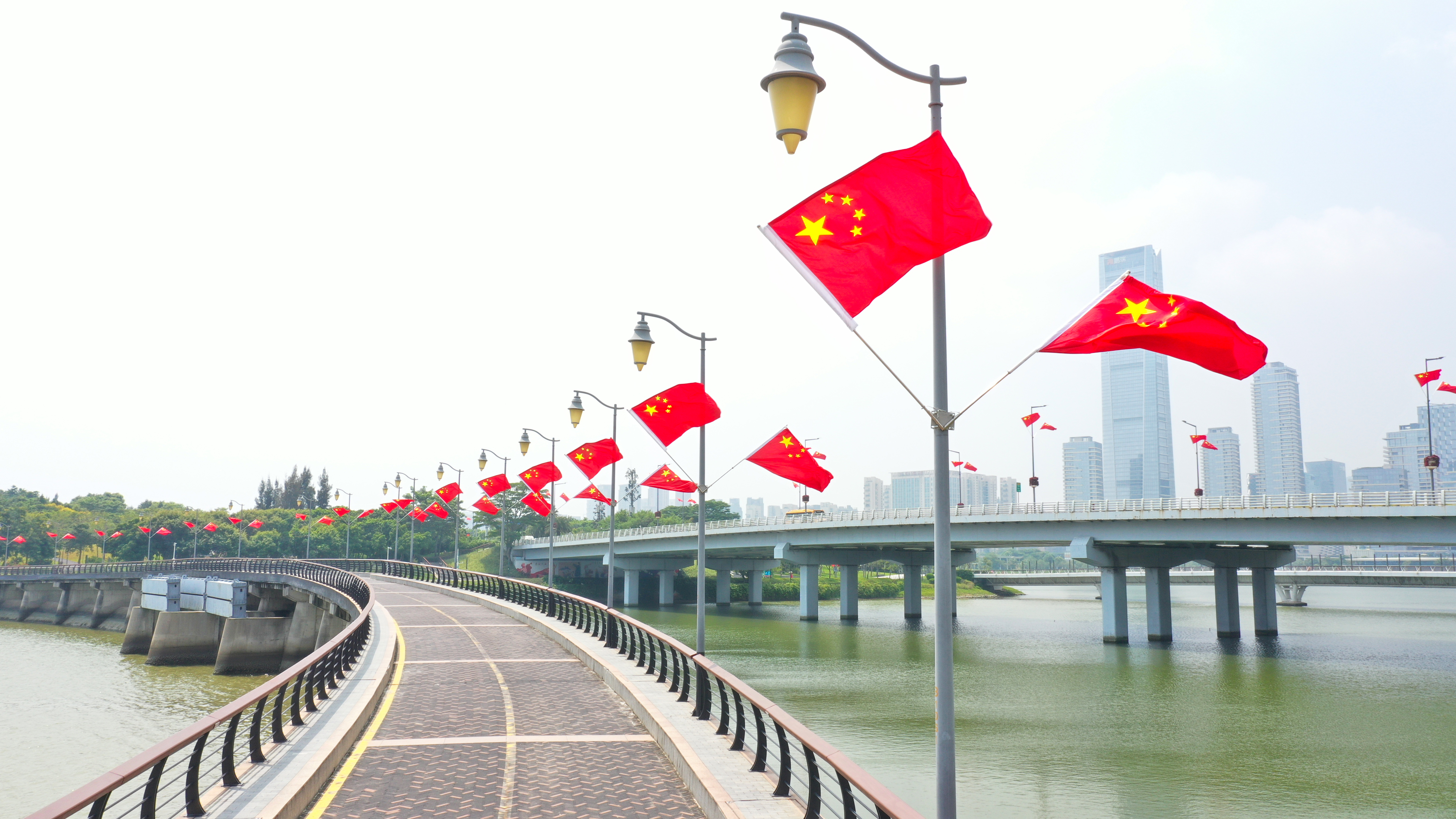 走在深南大道、北環大道、濱海大道、僑香路等城市主次幹道,隨處可見國旗飄揚,城管部門在全市500多條城市道路路燈桿上懸掛了近11萬面國旗,「中國紅」成為了最美主題色。