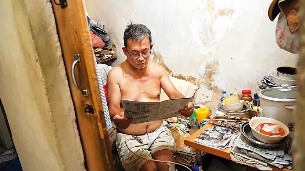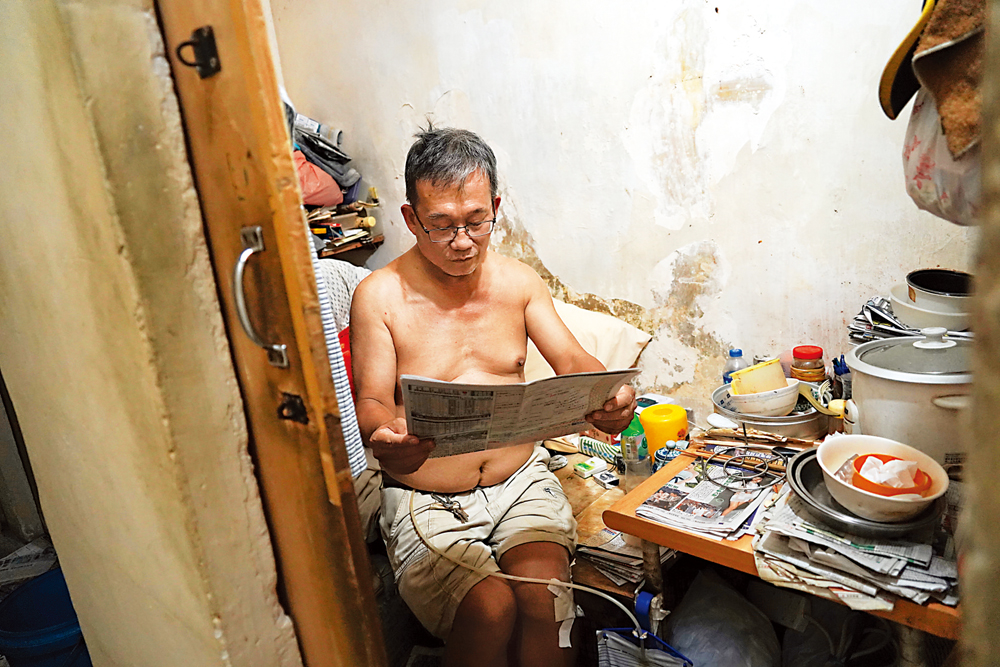龔伯伯在深水埗荔枝角道的一間板間房住了十年,單位「1劏11」,一進門混雜着殘羹變壞的霉味撲面而來,屋內約一米寬的走廊兩旁是密密麻麻的趟門。趟門後其中一個約30平方呎的板間房,就是龔伯伯的「家」,只放得下一張床和一張桌子,通風換氣亦全靠一把小小的抽氣扇。