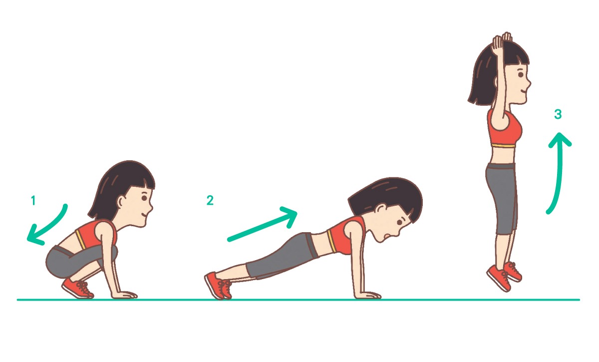 2. 雙腳向後跳,蹬至高平板式姿勢,並收緊小腹。