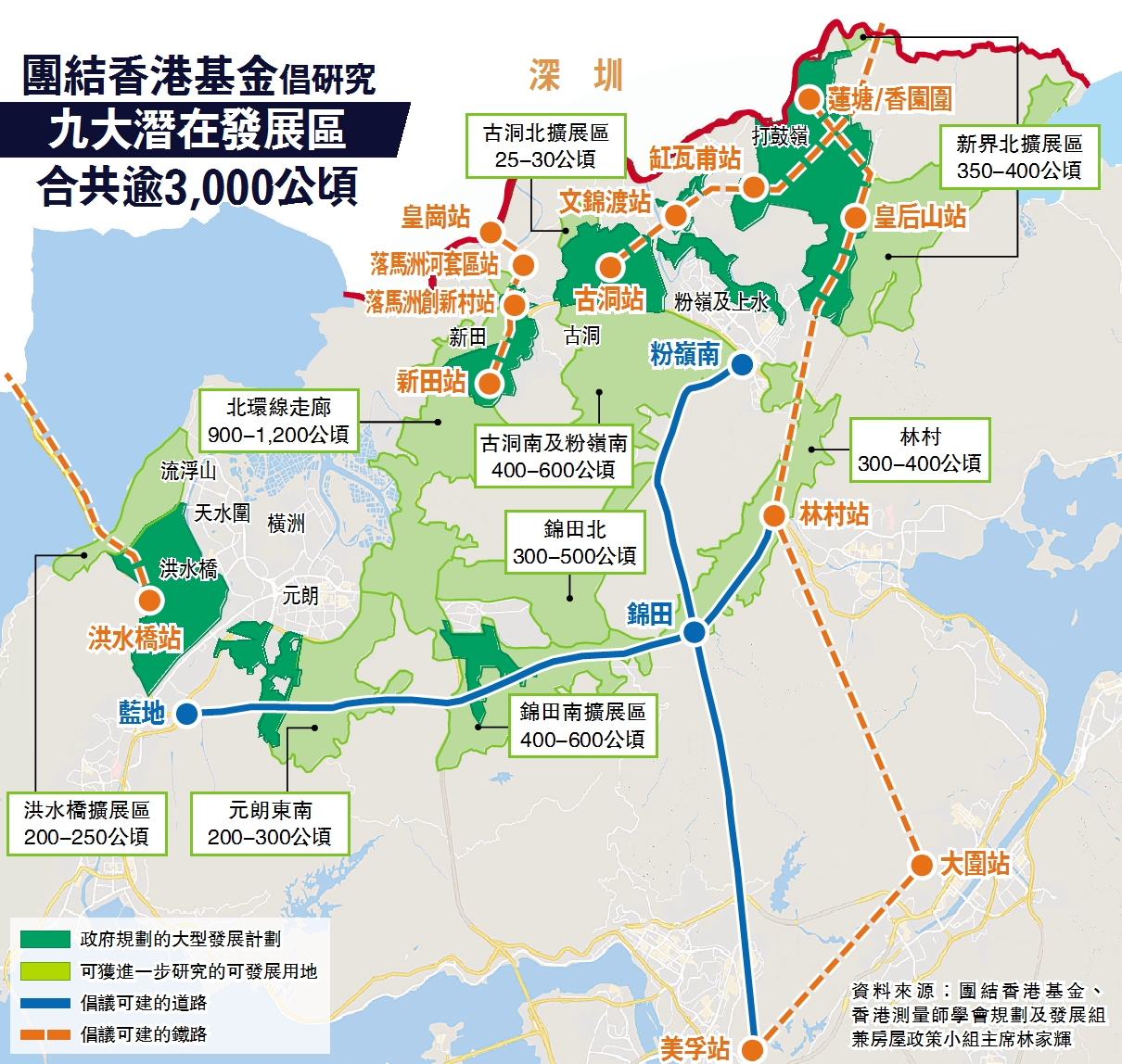 團結香港基金提出在新界發展九個新發展區,包括擴充政府已規劃的四個新發展區,形成洪水橋擴展區、錦田南擴展區、古洞北擴展區、新界北擴展區;另外五個新發展區涵蓋元朗東南、北環線走廊、古洞南及粉嶺南、錦田北、林村,料共可創造逾3000公頃用地。