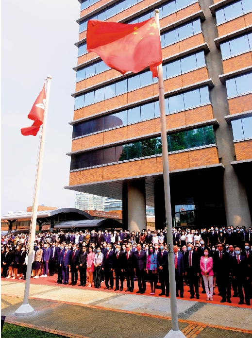 10時正,升旗儀式正式開始,全體人員肅立,共同注視緩緩升起的中華人民共和國國旗和香港特別行政區區旗,並高唱國歌。伴隨着響亮的歌聲,現場很多師生已熱淚盈眶,尤其是對於因疫情阻擋長時間不能回家的港漂學子,國歌喚起了他們的思鄉之情。