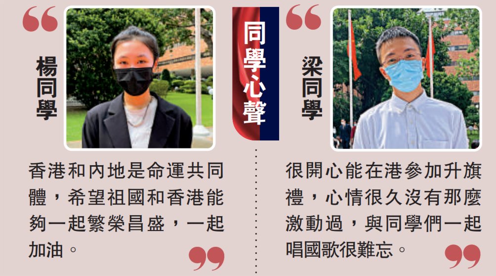 今年大一新生胡同學在參加升旗儀式後表示,雖然香港經過一些風浪,但覺得大家的心還是緊密連繫在一起,還是依舊喜歡祖國、心繫祖國。同樣都是大一的孔同學亦表示,之前在內地升旗覺得是一件平常事,但自從自己離開家鄉,才發現看到升旗會莫名的激動和自豪,也勾起了自己的思鄉之情。