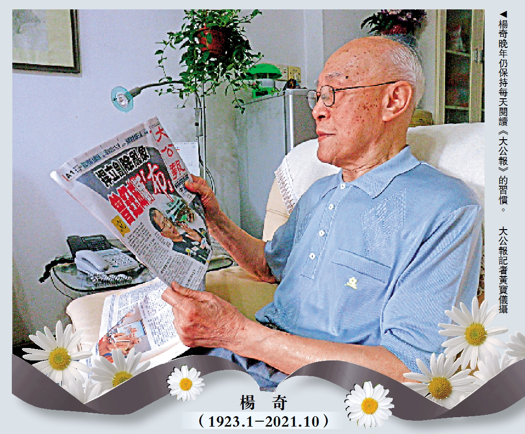 大公報記者 鄭曼玲、黃寶儀:2021年10月1日,一生愛國愛港、貢獻卓絕的報業泰斗楊奇先生在廣州因病與世長辭,享年99歲。從少年時執筆參加革命,到古稀時仍奮戰在辦報一線,這位報業元老始終與新聞為伍,也與香港結下了不解之緣。他的新聞事業起點和終點都在《大公報》,他用手中之健筆,記載了從香港淪陷、抗戰勝利到騰飛崛起、締造奇跡的重要歷史進程。楊老生前接受記者採訪時,曾飽含深情地說,香港就像一本值得傾盡畢生心血寫就的長篇小說,時而驚心動魄,時而峰迴路轉,其間無數故事情節讓人至今難以忘懷。而自己就像一隻在粵港兩地飛來飛去的雁鳥,充其量只是留下一些爪痕而已。