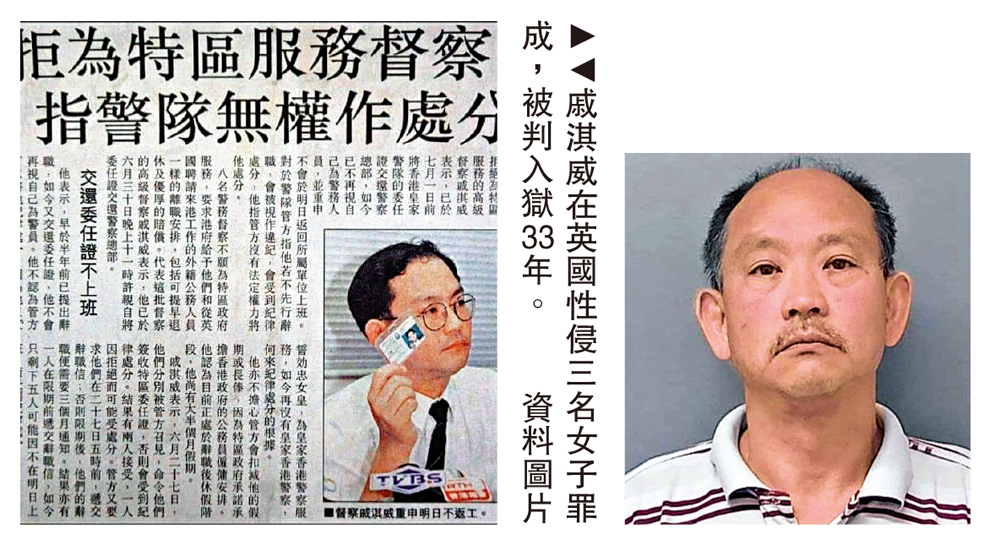 大公報記者 龔學鳴:英國東約克郡赫爾(Hull)皇室法院於上周三(9月29日)裁定,一名63歲前皇家香港警察Ken Chik涉及性侵三名女子,最終被判入獄33年。同案另一被告,37歲香港女子Tracy Choi被判入獄8年。有網民發現,Ken Chik原來是1997年6月在前民主黨立法會議員涂謹申陪同下高調開記招的高級督察戚淇威,他當時聲稱只忠於英女王,拒絕在香港回歸後為特區政府服務。網民揶揄,戚淇威可以一世食「皇家飯」(入獄)了。