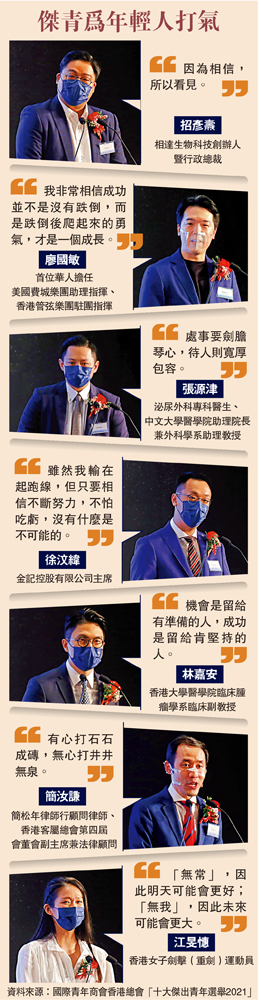 國際青年商會香港總會昨日公布「十大傑出青年選舉2021」結果,七名傑青包括劍擊運動員江旻憓、相達生物科技創辦人招彥燾、香港管弦樂團駐團指揮廖國敏、中大醫學院外科學系助理教授張源津、金記控股有限公司主席徐汶緯、港大醫學院臨床腫瘤學系臨床副教授林嘉安,以及簡松年律師行顧問律師簡汝謙。