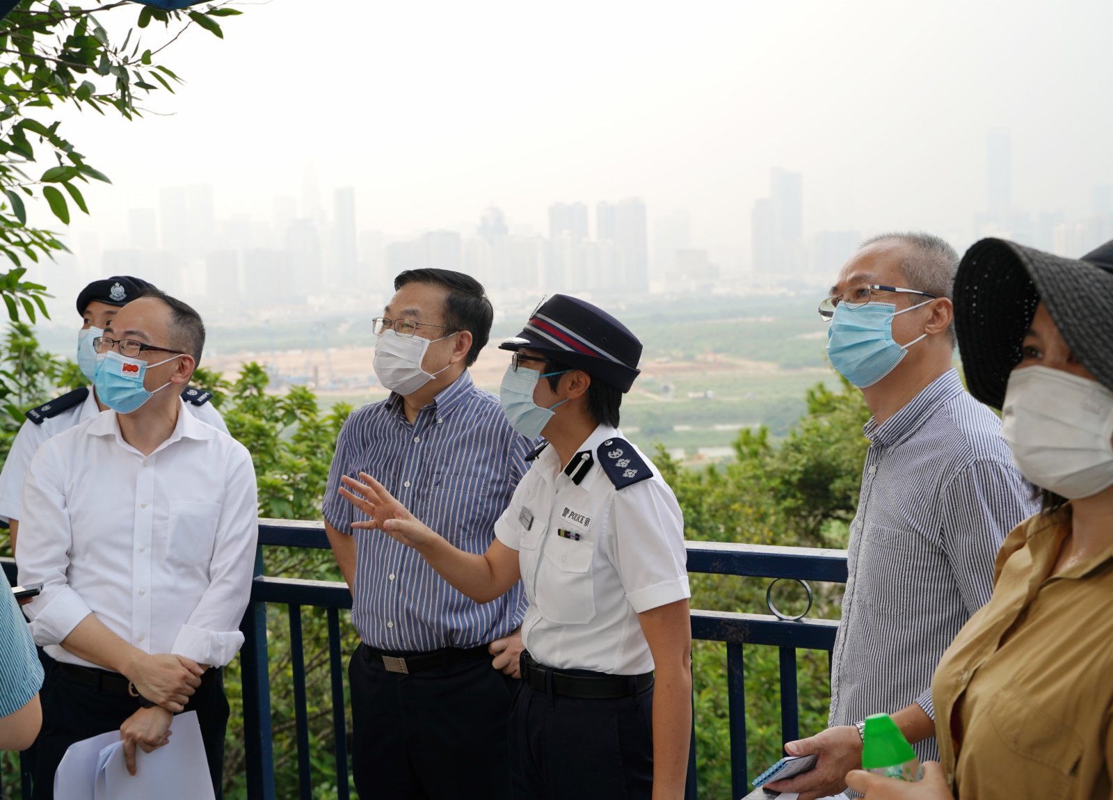 何靖離開香園圍後,途經文錦渡口岸、羅湖口岸,到達落馬洲口岸區,並登上位於高地的落馬洲警署,與當區總指揮官、社團代表及市民等,一起眺望正在施工的皇崗口岸和河套區現場。看着河套區初步平整的工地,有市民朋友表示,希望建設速度可以更快些!也有市民朋友建議,規劃可以更大手筆些,避免切塊式、隔離式的發展。