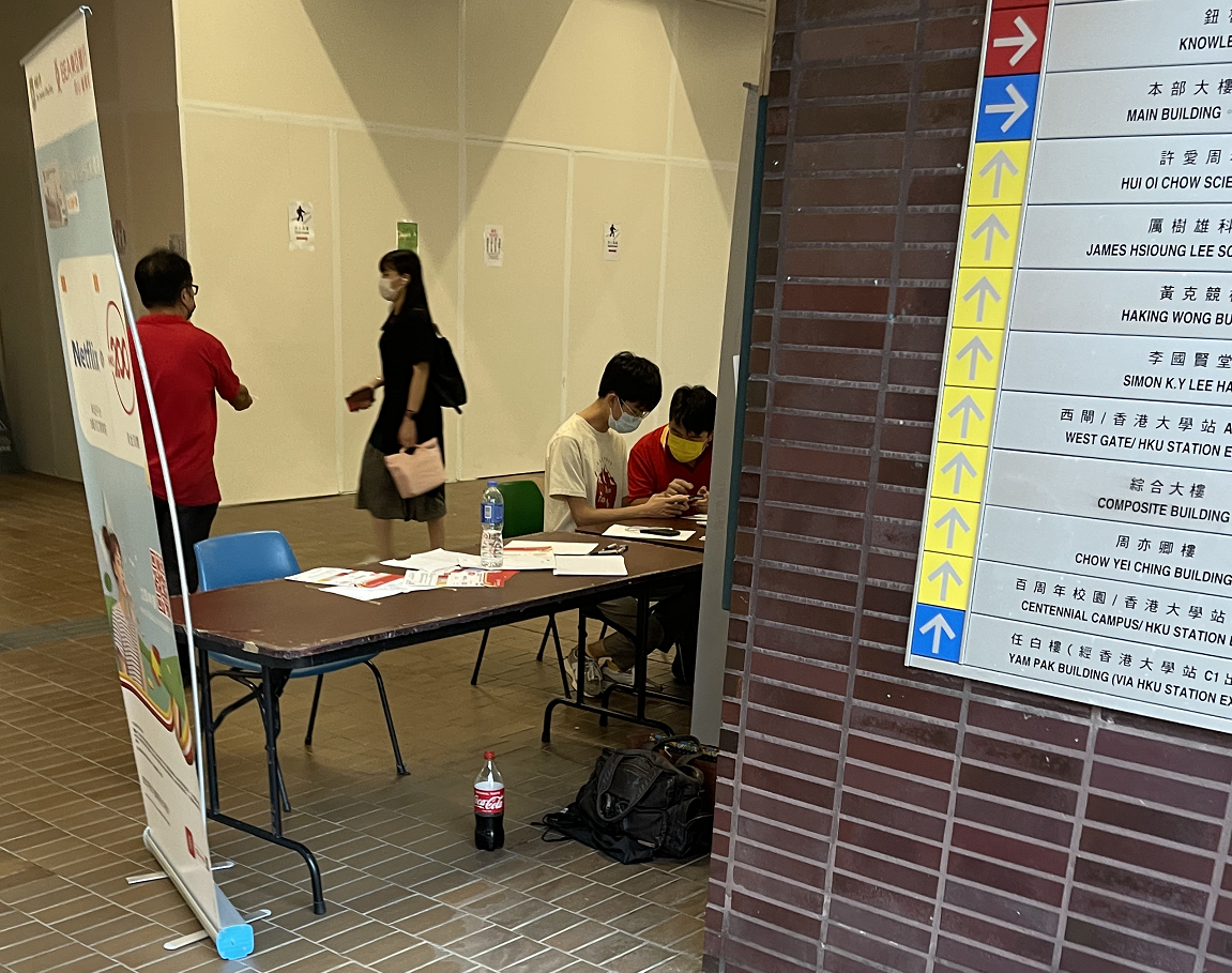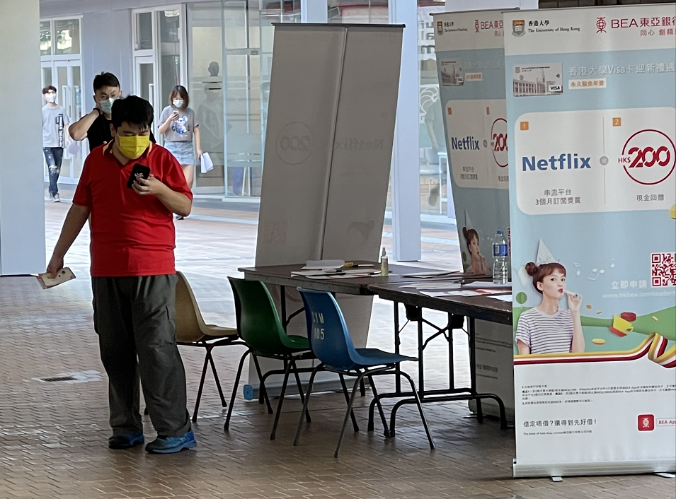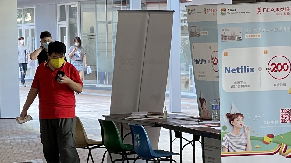 至記者下午5:56離開校園時,仍見到該推銷人員戴着「撐暴」口罩,向往來學生推廣信用卡服務。