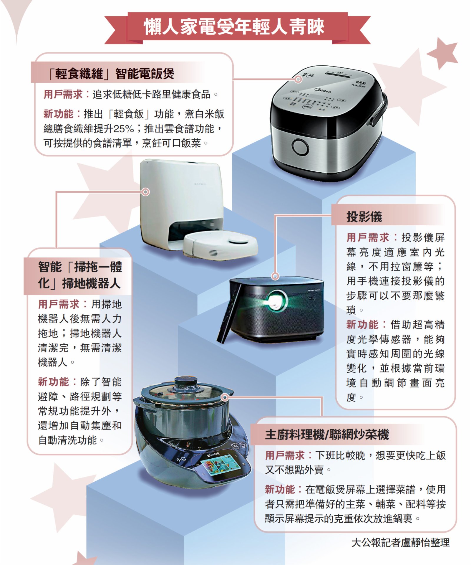 國慶假期,在手機點開網購平台APP,琳琅滿目的小家電商品映入眼簾。乾衣機、洗地機、掃地機器人等智能小家電紛紛躋身暢銷榜,電器消費向着「潮」、「聰明」和「高顏值」升級。大公報記者看到,今年不少熱銷智能小家電,是根據年輕人的需求「反向定製」,用起來更加貼心,可以更加「懶」。