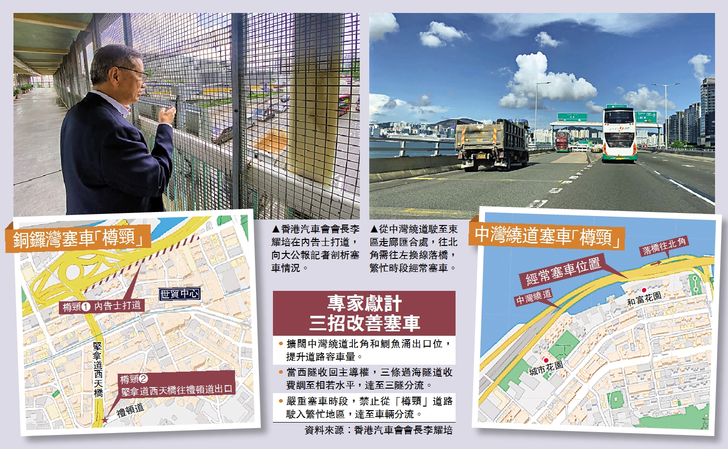 大公報記者近日邀請香港汽車會會長李耀培,驅車到兩大「塞爆」黑點:中環及灣仔繞道的「死亡交叉位」,以及內告士打道世貿中心對開的「樽頸位」,實地考察尋找癥結,李耀培更提出三招「減塞」建議。