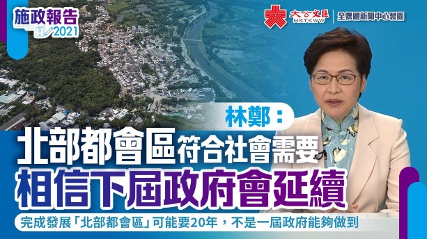 林鄭月娥今晚出席施政報告電視論壇時表示,完成發展「北部都會區」可能要20年,不是一屆政府能夠做到,無論誰人出任下一任特首,相信下一屆政府都會繼續執行施政報告的政策,因為社會需要更多土地、更多房屋以及滿足經濟需要。