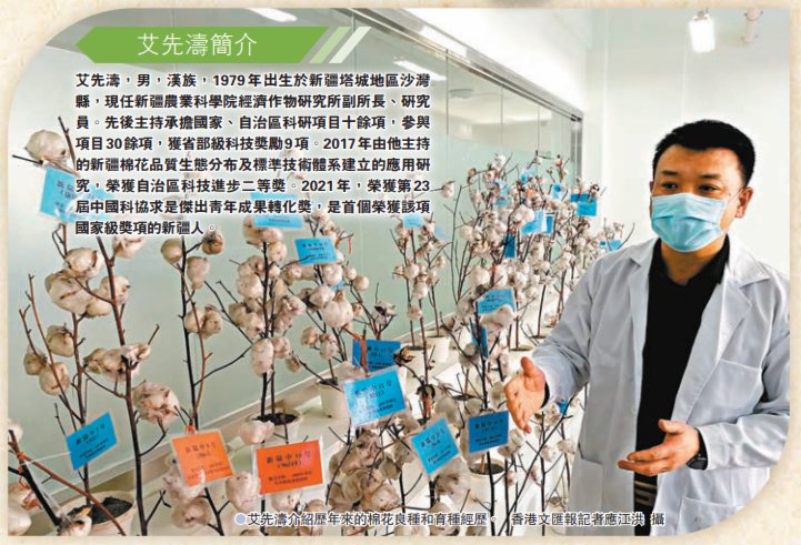 (香港文匯報記者 應江洪)「我們從事育種工作的(科技人員)都有個夢想,就是培育出優良的品種,大面積推廣,服務『三農』、造福社會……」新疆棉花育種專家、新疆農業科學院經濟作物研究所副所長艾先濤,自大學畢業之後就進入棉花育種行業,近20年來,他和他的團隊先後選育出早熟、高產、優質、適宜機採多類型棉花新品種11個,累計推廣面積超過1,000萬畝,取得顯著的社會效益和經濟效益。「育種的整個過程少則五六年,多則八到十年時間。這是個苦中有樂、每天都能看到希望的過程。」艾先濤笑着說,外出在條田裏一眼就認出自家品種,就像在茫茫人海中一眼認出自家孩子,「當下就會多看幾眼品評一番」。