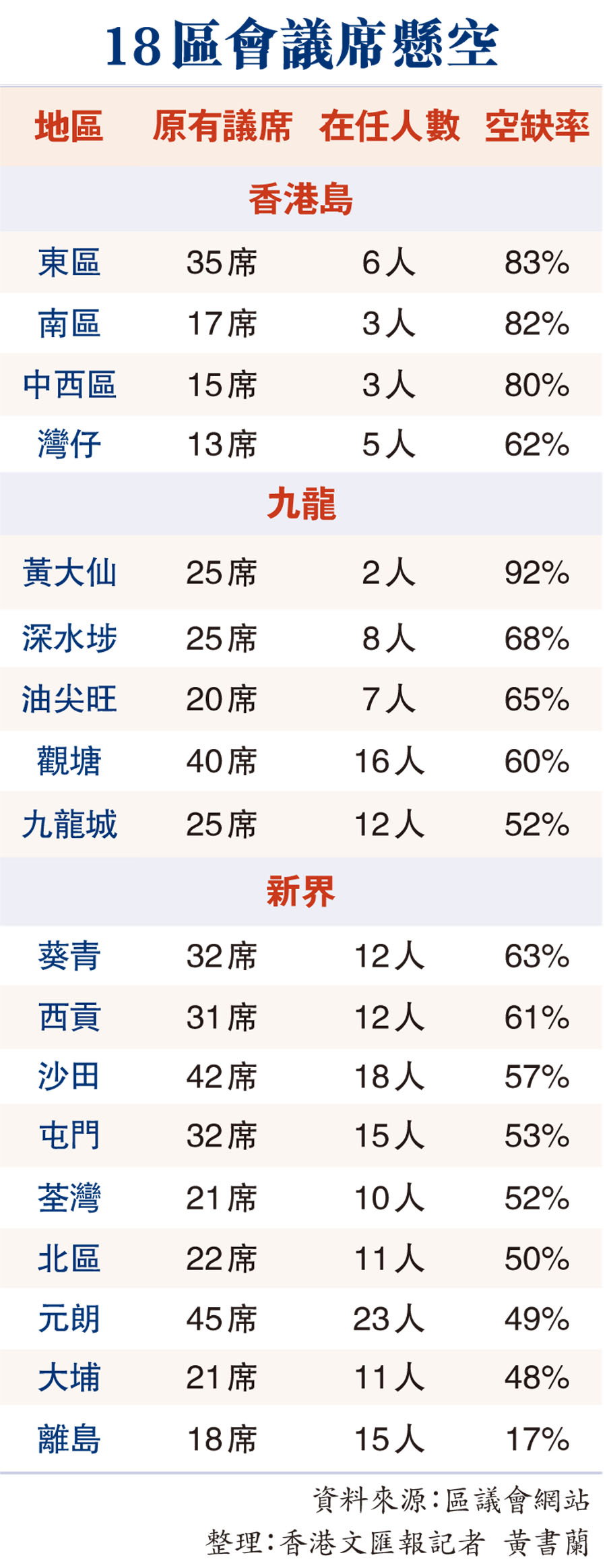 今屆區議會原有479名區議員,民政事務局及民政總署日前在提交立法會的文件指出,截至本月4日,在任區議員總數已減至189人,共14個區議會的區議員人數銳減過半(見表)。