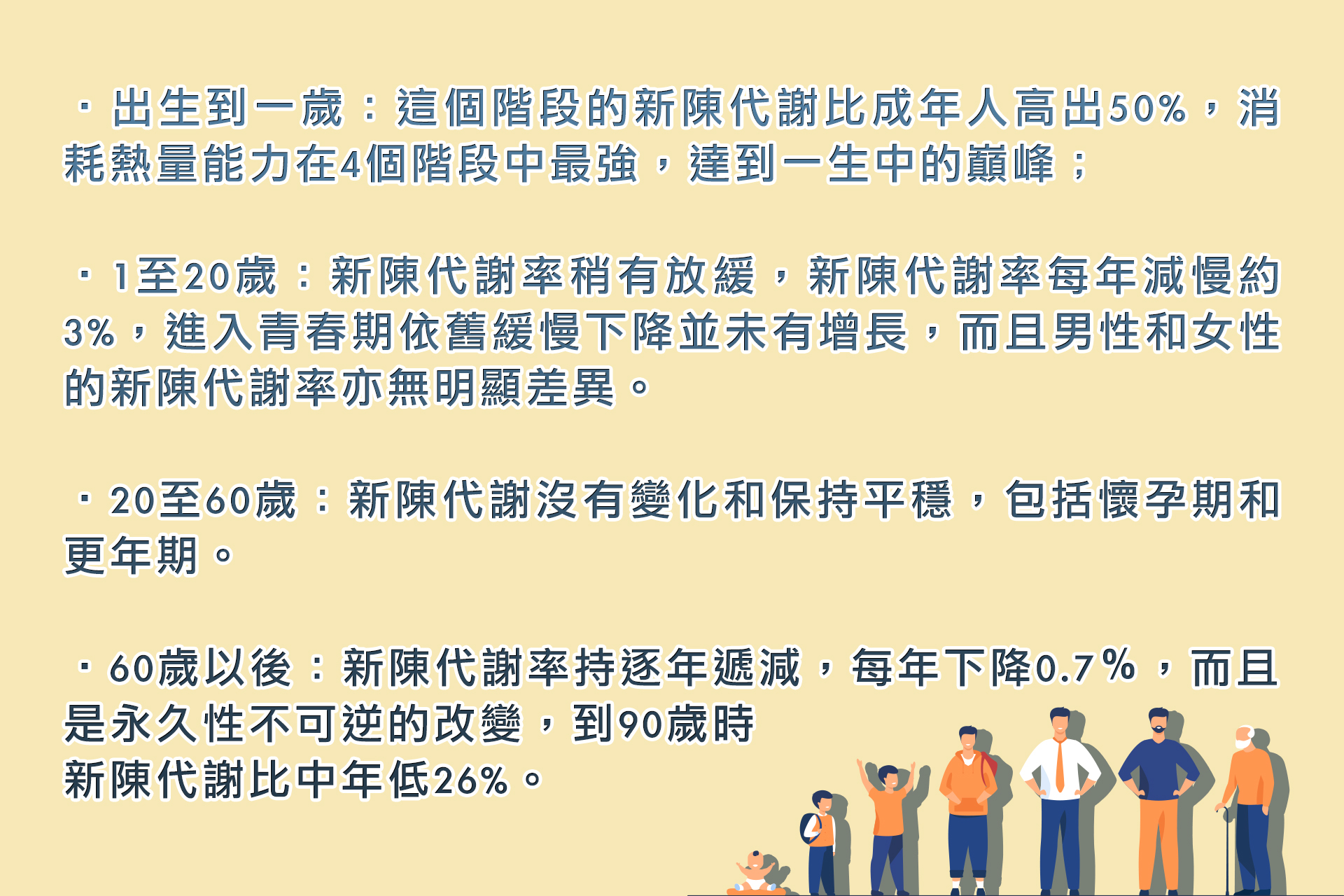是次研究發現,綜觀人類的一生,不論男女,新陳代謝主要可以分為4個階段: