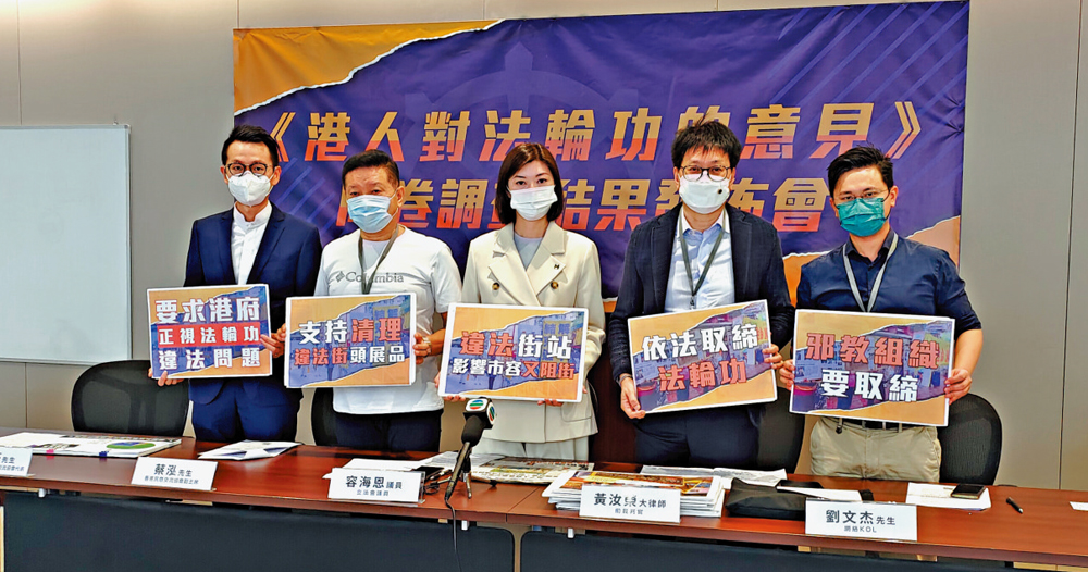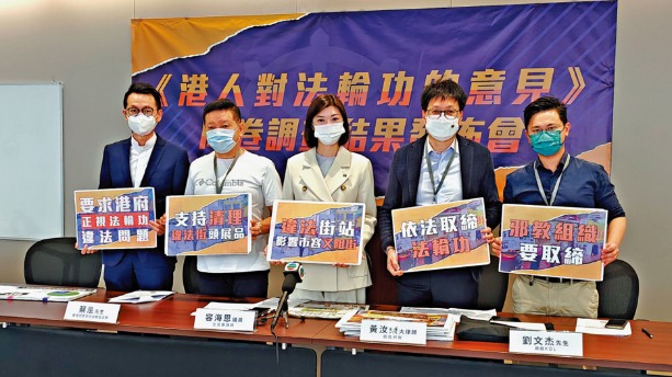 有見及此,香港民意交流協會今年九月至十月期間,以「港人對法輪功的意見」為題,成功訪問8855名市民。結果顯示,68%市民認為法輪功是邪教組織;71.3%認為法輪功宣傳街站阻街及影響市容;71.3%認為法輪功常用口號會引起市民對中央政府的憎恨;71.7%認為宣傳內容涉觸犯國安法;71.7%支持取締法輪功。