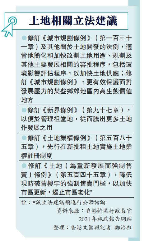 林鄭月娥表示,全面落實「北部都會區」發展計劃需時20年,特區政府會全速進行有關工作,檢視阻礙基建的因素,修訂有關條例,全面精簡程序,「拆牆鬆綁」。她強調「計劃好都要執行到」,指出會於今年內展開諮詢,希望於明年內向立法會提交涉及土地發展的條例修訂,包括城市規劃、填海、路政和收地等四方面的條例。