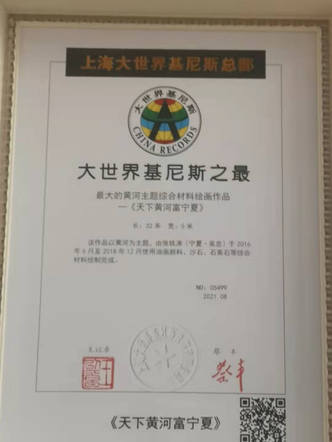 (大公文匯網記者 王尚勇)10月8日,記者從寧夏吳忠美術館了解到,寧夏藝人張鐵濤創作的油畫作品《天下黃河富寧夏》獲得了上海大世界吉尼斯總部頒發的大世界吉尼斯之最證書。「這幅畫作大氣磅礴,極富視覺衝擊力,給人身臨其境之感。」期間,寧夏吳忠美術館的一幅以黃河為主題的綜合材料油畫作品《天下黃河富寧夏》引得遊人駐足觀賞,嘖嘖稱讚。