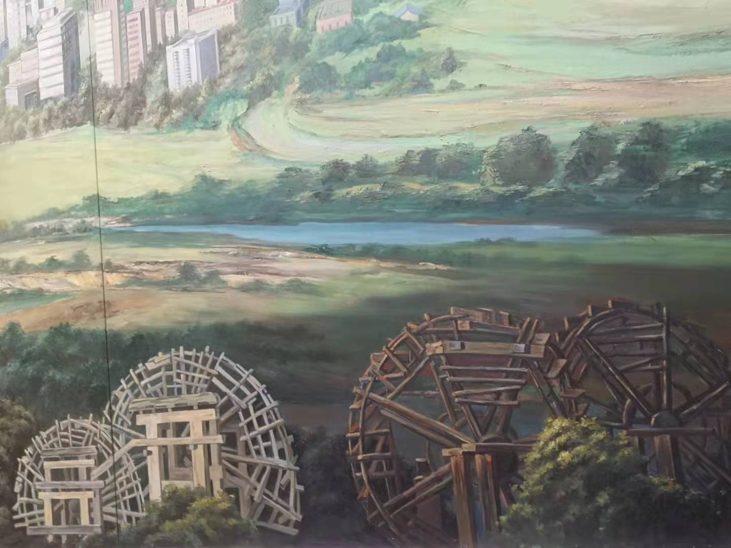 據悉,張鐵濤還用無人機航拍,拍下大量黃河兩岸的照片。根據無人機拍下的照片,張鐵濤又結合寫生草圖進行構思,將油畫創作的技法大膽創新,融合國畫的創作手法,並使用多種油畫顏料、砂石、石英石等綜合材料,終於在2018年12月創作完成巨幅油畫《天下黃河富寧夏》,生動再現黃河兩岸魚米之鄉的美景。