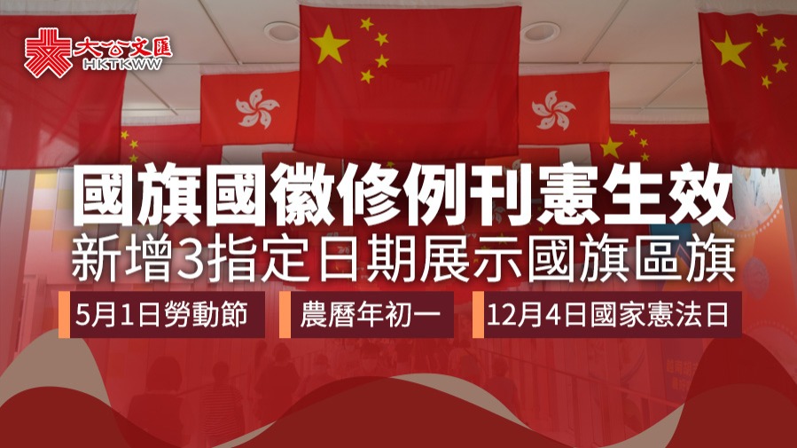 大公文匯全媒體報道,《國旗及國徽(修訂)條例》今日(8日)正式刊憲生效。政府發言人表示,修例的根本原則和精神是尊重國家、尊重作為國家象徵和標誌的國旗及國徽,並就國旗及國徽的使用、禮儀、教育和推廣作出明確規定。對意圖侮辱國旗或國徽、公開及故意作出侮辱行為的人,《條例》保留相關刑責和罰則,並加以清晰化,予以懲治阻嚇。
