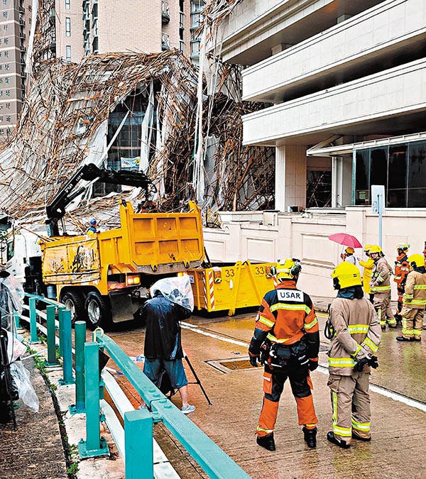 (香港文匯報記者 蕭景源)颱風「獅子山」襲港,昨晨半山豪宅比華利山外牆一幅100米乘150米巨型維修棚架在狂風暴雨中倒塌,大量竹枝及雜物猶如「山泥傾瀉」般,沿屋苑對開斜坡湧落對下的樂活道行人路及馬路,7名工人及兩部駛經私家車遭沒頂,其中5名工人及兩車司機自行逃出脫險。消防員趕至冒着惡劣天氣展開搜救行動,花逾1小時20分先後救出其餘兩名被困工人,其中男工無恙,地盤女雜工則不幸身亡。勞顧會勞方代表鄧家彪批評,天文台預警機制失效,令承建商無從評估天氣是否適合戶外工作。