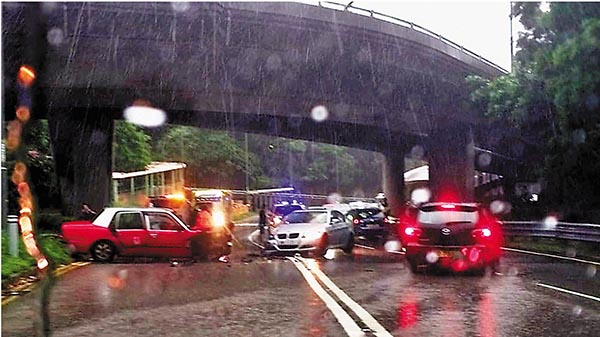 昨晨9時09分,大埔道近六合村對開一輛的士與一輛私家車發生碰撞,兩車撞擊力甚猛,的士打了一個「白鴿轉」,車頭嚴重損毀,事件中兩名司機頸部受傷,需要送院治理。另外,昨晨10時20分,一輛私家車沿葵涌道落龍翔道往觀塘方向,疑路面濕滑失控「自炒」,車身撞向路邊護土牆,車身嚴重損毀,幸司機無恙,自行落車報警等候警方到場協助。