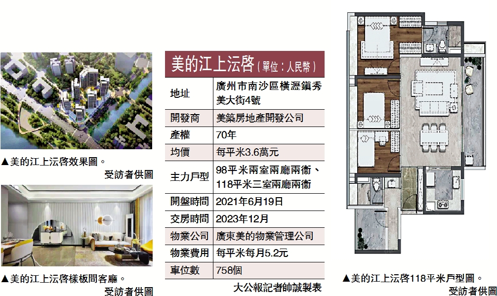 美的江上沄啟項目,盡享南沙橫瀝島尖一線江景,由中國上市房企26強的美的置業與中國房地產百強企業綠城中國聯合開發。項目位於明珠灣橫瀝島尖,佔據南沙核心區的重點片區,佔地面積2.27萬平方米,建築面積約12萬平方米,由5棟住宅、1棟商業樓組成,周邊外部配套一應俱全。