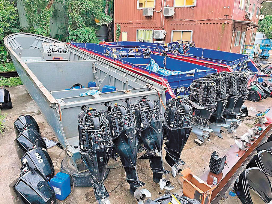 5艘快艇每艘長約17米,船身無登記號碼,掛有四五部300匹至400匹的大馬力舷外引擎,合共有22部舷外引擎,總值700萬元。另外,警方在現場檢獲一批建造工具,包括電鑽、電批、鏍絲批等。警方指,根據《進出口條例》第14A條,任何人為作走私用途而建造的250總噸以下船隻進行修理或維修,即屬犯罪,最高可處罰款200萬元及監禁7年。