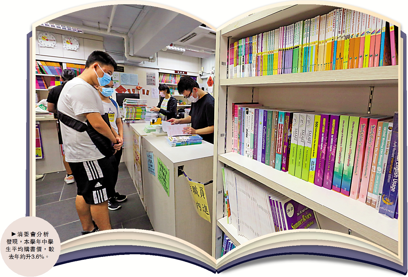 漢榮書局經營教科書及參考書的銷售已50年,負責人石漢基表示,該書局2021/22學年的教科書價格平均上升2%,有部分上漲3%至4%。據石漢基介紹,中一購書費普遍在3400元左右,因為中一要買中英文字典等輔助書,一本字典就要逾300元,但買了可以用好幾年。
