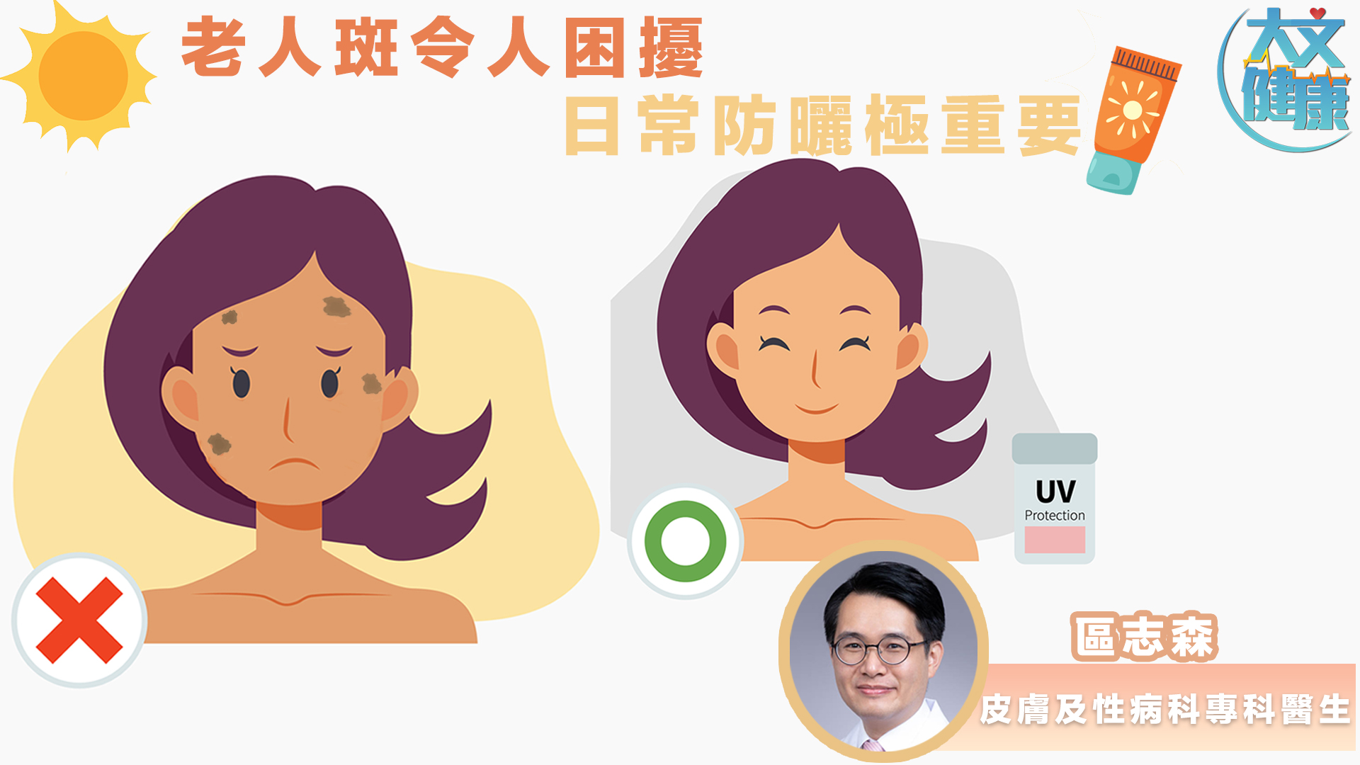 老人斑是不少人困擾的皮膚問題。日常生活中,除了注意防曬,做好防曬措施,現時醫學界並未有其他針對性的口服或外用藥物,預防老人斑形成。最後提醒大家,如果皮膚上出現新的不明斑點,或舊斑點有新變化,最好盡快求醫,以確定皮膚是否患有病變。