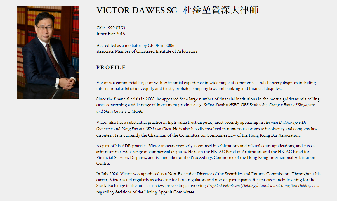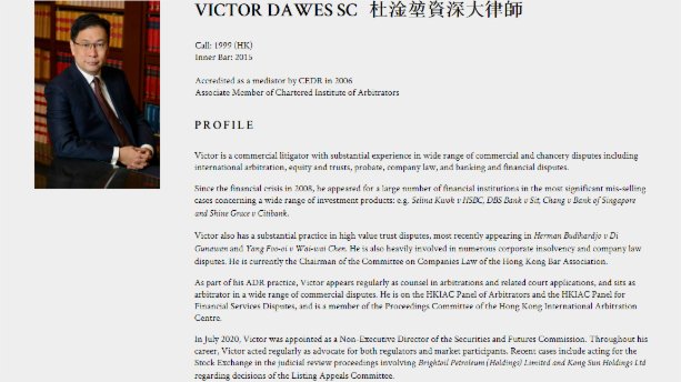 翻查資料,杜淦堃現年44歲,在倫敦政治經濟學院取得法學士學位,並於1999年在香港取得大律師資格,執業範圍主要為民事法。2015年3月31日,終審法院首席法官委任杜淦堃為資深大律師。2020年7月6日,財政司司長陳茂波根據行政長官轉授的權力,委任杜淦堃資深大律師出任證監會非執行董事。今年9月30日,司法機構宣布委任杜淦堃資深大律師等6人為高等法院原訟法庭特委法官。