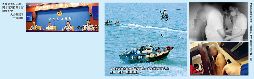在本月1日至7日聯合「清灣行動」期間,廣東執法部門共破獲55宗涉走私集團案件,抓獲疑犯353人,查獲860艘大飛等非法船隻,查處49間非法船廠、62個非法冷庫及交易場所,查扣進口發動機、車輛、凍品、油品以及違禁品一批。