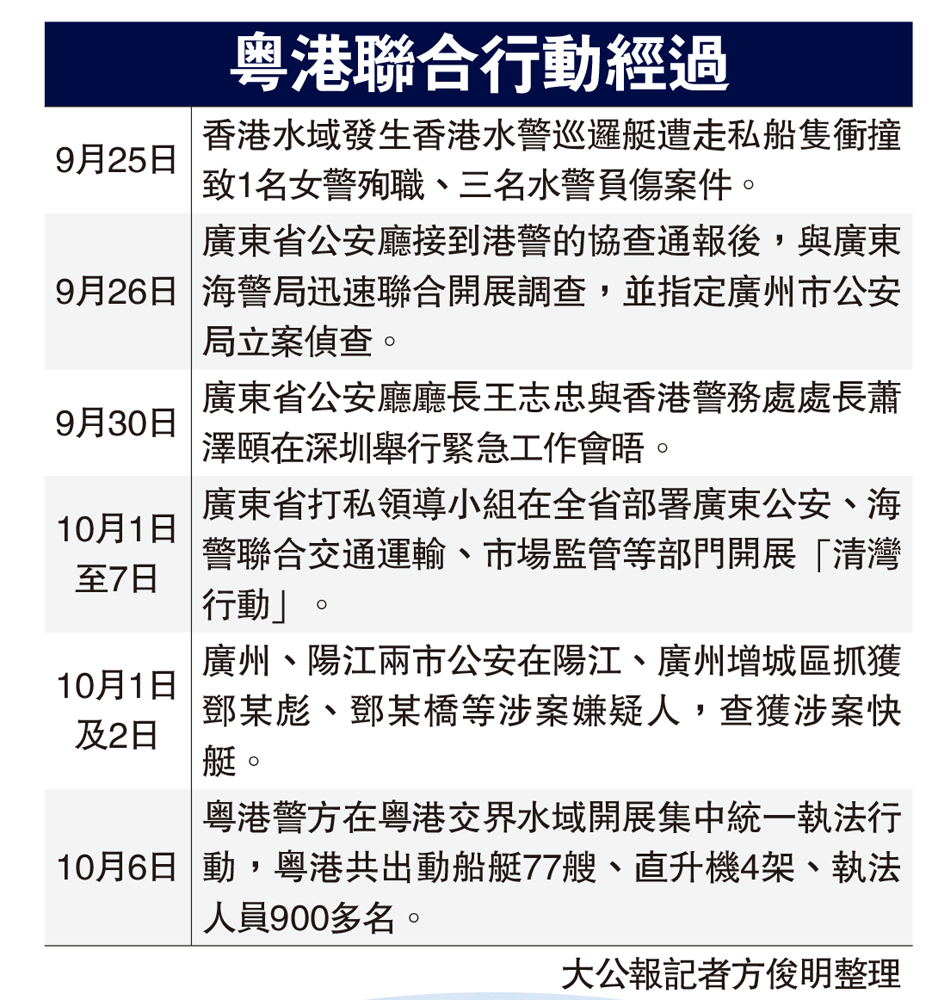 據了解,廣東省公安廳廳長王志忠與香港警務處處長蕭澤頤,於上月30日在深圳舉行緊急工作會晤,就「9·25」案件偵辦、聯合打擊跨境走私、深化粵港警務協作、建立更為高效的直接聯絡機制等方面達成高度共識。廣東省公安廳副廳長張銳透露,廣東公安、海警會同香港警方於本月6日在粵港交界水域開展集中統一執法行動,查獲95艘大飛等非法船隻,抓獲涉嫌走私違法犯罪分子183人。