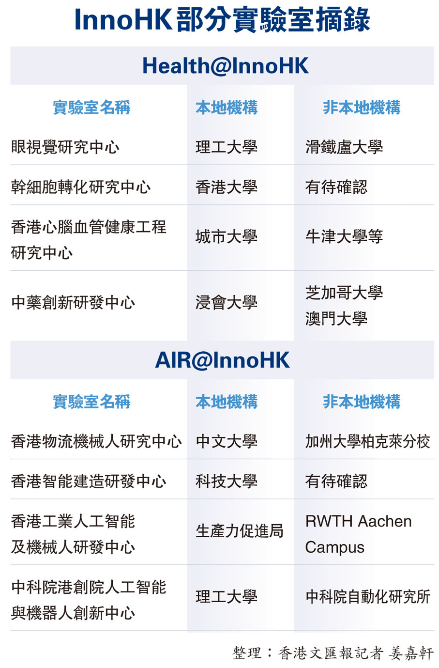特首上周三發表新一份施政報告宣示,InnoHK已成功招攬了28個世界級科研團隊進駐成立實驗室。香港文匯報近日查訪取得全部28個實驗室的名單,當中9個由香港大學主理,中文大學6個,科技大學、理工大學和城市大學各3個,而浸會大學及香港生產力促進局也各主導1個實驗室,餘下2個則由中國科學院香港創新研究院負責,並與多所本地大學及中科院旗下研究單位合作。海外合作機構則雲集頂尖名校,包括牛津大學、劍橋大學、倫敦帝國學院、哈佛大學、史丹福大學、加州大學柏克萊分校、麻省理工學院、加州理工學院等。