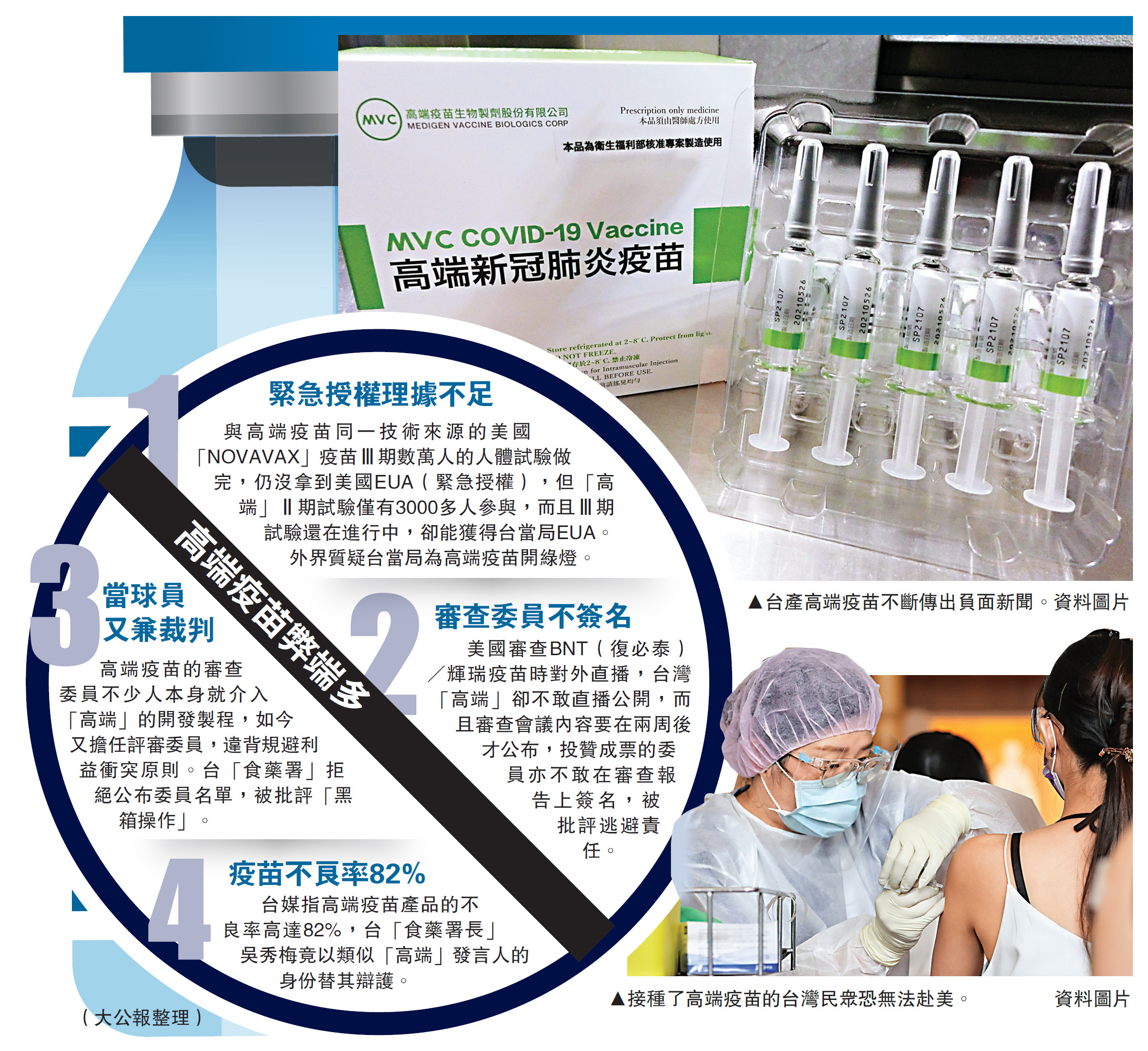 美國近日宣布入境承認的6款疫苗,包括輝瑞/復必泰、阿斯利康、強生、莫德納、中國國藥及科興,而台灣自產的高端疫苗不在美國承認的疫苗名單中。據統計,目前島內打了第一針高端疫苗的民眾已超過72萬人。但由於美國不承認高端疫苗,恐怕會導致其他國家和地區也不予承認,台灣輿論擔憂,接種台產疫苗的民眾未來可能無法出境,等於白打疫苗了。有台灣民眾指出,高端疫苗的品質備受質疑,台當局應停止讓民眾接種。