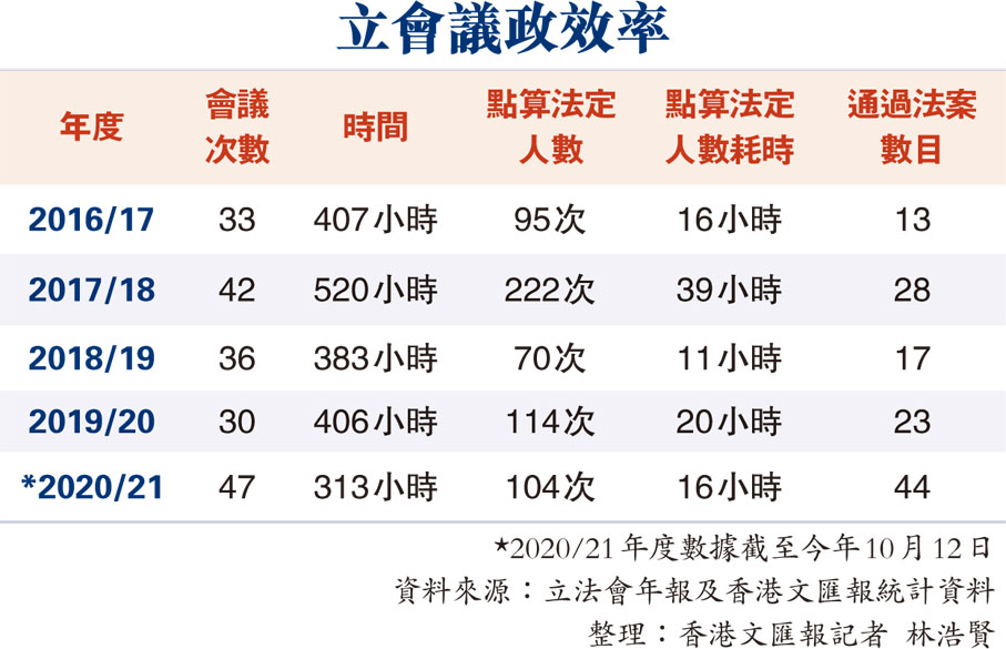 香港文匯報綜合立法會過往年報及自行統計的資料後發現,雖然第六屆立法會繼續履職這一年的會期較過往多了近3個月,會議次數增加,但在議會高效運作下,會議時間反而減少,議會的效率大大提高,通過了更多惠民議案。