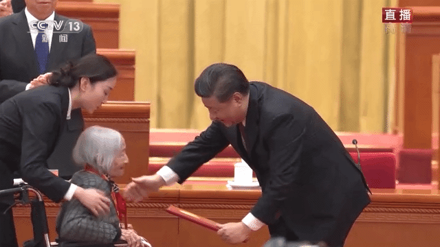 98歲高齡的夏森老人坐着輪椅上台領獎,她試圖起身去接總書記頒授的榮譽證書。總書記輕輕拍拍她的肩膀,示意她坐下,暖心地彎腰俯身把證書遞到老人手中。全場掌聲雷動,眾多網友熱淚盈眶。