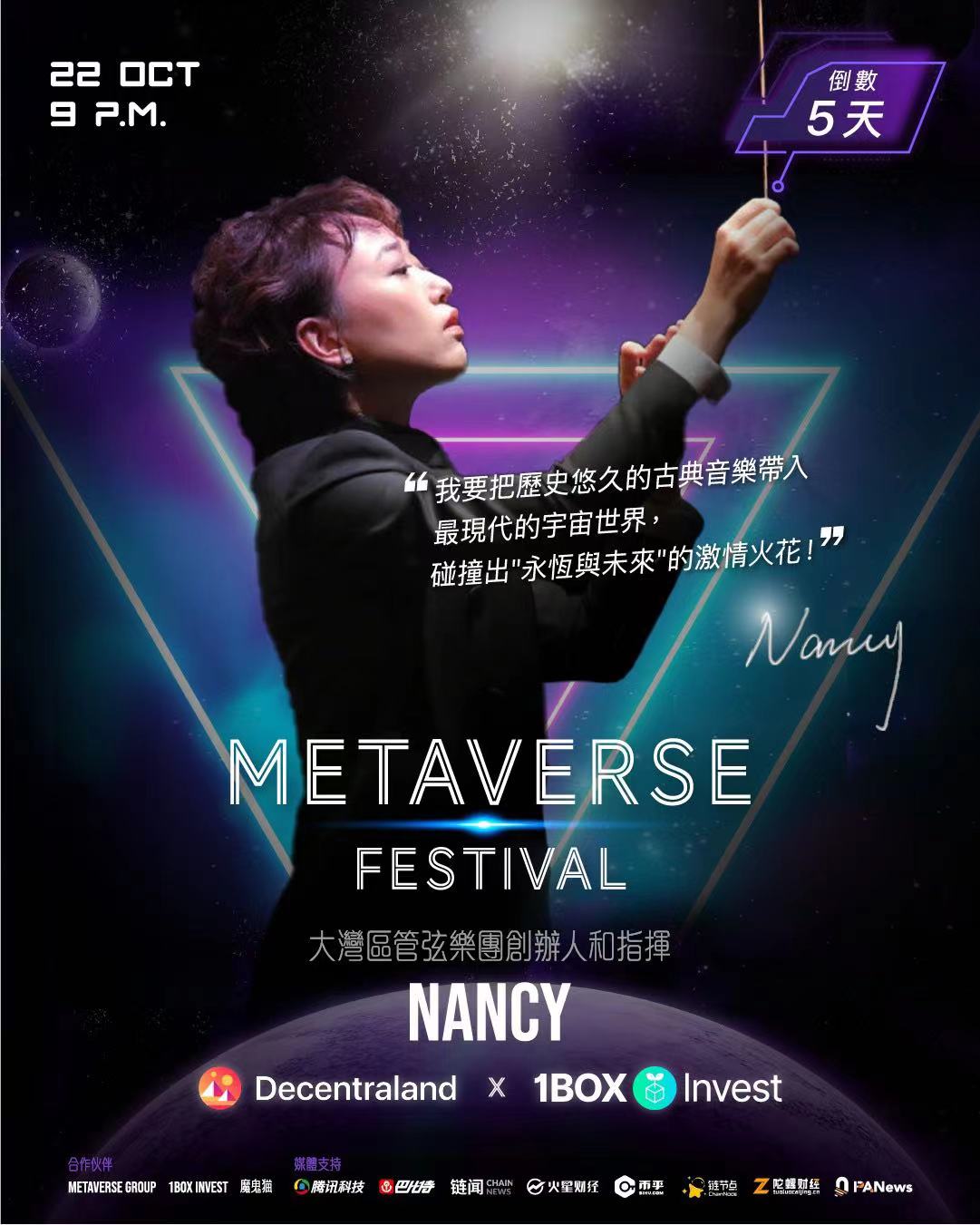 大公文匯全媒體報道,由1BOX攜手全球最大元宇宙Decentraland舉辦首屆「元宇宙音樂節」將於10月21日至24日開啟線上音樂盛會。是次活動將邀請超過80位知名藝術家參加包括 Deadmau5,Paris Hilton x Fewocious DJ set,Nina Nesbitt,Alison Wonderland 等全球知名音樂人。新生代作曲家、指揮家,大灣區管弦樂團的創辦人李楠(Nancy)亦獲邀擔任表演嘉賓,將在音樂節第二日(22日)表演,同時也會推出一系列Nancy相關的NFT作品,包括可穿戴設備,簽名海報等,令人期待。