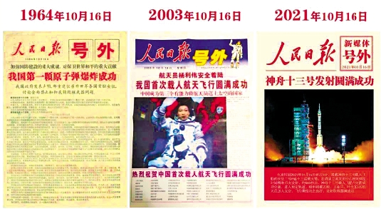 10月16日,神舟十三號發射圓滿成功,人民日報微博發了一條「跨越時空的同一天」引發網友熱議。1964年10月16日,中國第一顆原子彈爆炸成功;2003年10月16日,中國首次載人航天飛行圓滿成功;2021年10月16日,神舟十三號發射圓滿成功;三張同一天的號外,記錄着一代代中國人的奮進前行。